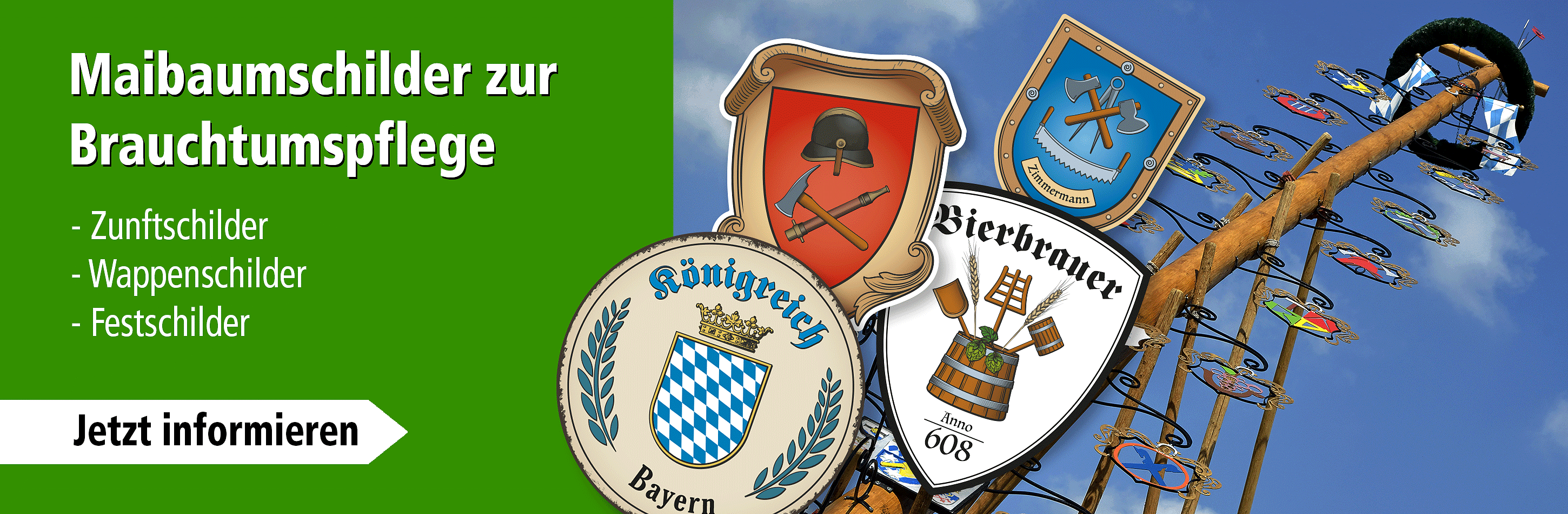 Maibaumschild mit Ihrem Wunschtext und Logo der Wappenserie BL im breiteren Wappenformat. Unsere Maibaumschilder zur Brauchtumspflege aus deutscher Fertigung sind langlebig, außerordentlich stabil und somit wahre Schmückstücke für jeden Maibaum. Merkmale des Maibaumschildes mit Ihrem Wunschtext und Logo - Wappen BL - breiteres Wappenformat - MAI-BL-71: Ausführung: Wappenform BL - breiteres Wappenformat Druck: hochwertiger, ein- oder beidseitiger Digitaldruck in vier Farbvarianten mit anschließender UV/Antigraffiti-Schutzlackierung Material: Aluverbund, Stärke 3 mm Abmessungen (Höhe x Breite): 350 x 280 mm 400 x 320 mm 500 x 400 mm 600 x 480 mm 650 x 550 mm 700 x 560 mm 800 x 640 mm Verarbeitung: formgefräst gemäß der Artikelabbildung Verpackungseinheiten: 1 Maibaumschild Bitte beachten Sie: Dieses Maibaumschild kann mit individuellen Attributen bestellt werden. Geben Sie Ihre Wunschangaben in das Eingabefeld auf dieser Seite ein und laden Sie Ihr Logo auf unseren Server. Nach Ihrer Bestellung setzen wir Ihre Wünsche um und übermittelt Ihnen eine Korrekturdatei zur Ansicht. Bitte prüfen Sie die Inhalte dieser Korrektur auf Fehler und erteilen uns, sofern alles in Ordnung ist, unbedingt die Druckfreigabe. Ihr Schild kann erst dann produziert werden, wenn uns Ihre Druckfreigabe vorliegt. Schilder mit Text- und Zeichenänderungen oder nach Ihrer Vorgabe gelocht sind individuelle Schilder und somit grundsätzlich vom Rückgaberecht ausgeschlossen. Bei individuellen Maibaumschildern gilt die angegebene Lieferzeit erst nach erfolgter Druckfreigabe. Maibaumschilder in der Höhe wirken deutlich kleiner als Schilder, die direkt vor Ihnen liegen. Entscheiden Sie sich lieber für ein größeres Schilderformat – insbesondere, wenn Ihr Wunschschild auch Textinhalte besitzt – damit die Inhalte gut zu erkennen sind. Unsere Maibaumschilder werden sowohl in der Standardausführung als auch individualisiert, sofern vorgesehen, nur bestellbezogen produziert und sind somit grundsätzlich vom Rückgaberecht ausgeschlossen. Da die Befestigungen für Maibaumschilder zu individuell sind und meistens maßgefertigt von Schlossern und ähnlichen Berufsgruppen produziert werden, können wir diese nicht anbieten.