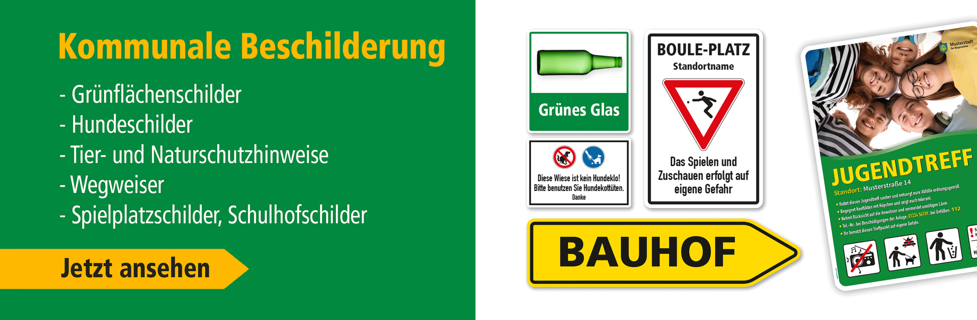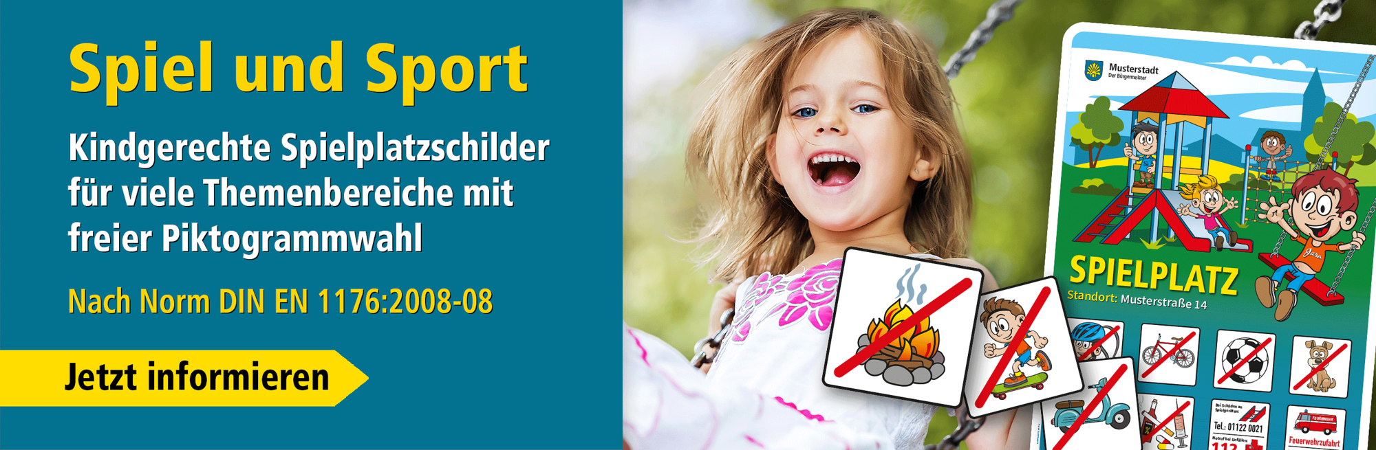 Für Städte und Gemeinden führen wir im Bereich der kommunalen Beschilderung aussagekräftige Schilderartikel für verschiedene Themenbereiche wie z.B. den Tier- und Naturschutz, Friedhöfe und andere Grünflächen sowie Gewässer und Uferbereiche. Die Schilderkategorie Spiel und Sport beinhaltet zahlreiche, nach Schilderserien gegliederte Spielplatzschilder für verschiedene Spiel- und Freizeitaktivitäten sowie die erforderlichen, der Norm DIN EN 1176:2008-08 entsprechenden Sicherheitshinweise. Die innovativen Schilderausführungen der einzelnen Spielplatzschilder beinhalten kind- und jugendgerechte Darstellungen von Spielgeräten und spielenden Kindern bzw. fotografische oder silhouettenhafte Umsetzungen des jeweiligen Spielplatz- oder Sportthemas in Kombination mit aussagekräftigen Piktogrammen und zusätzlichen Informationen, die für die gängigsten Spielplätze geeignet sind. Die frei zu wählenden Spielplatzpiktogramme teilen Kindern und Spielplatzbesuchern mittels aussagekräftiger, leicht zu verstehender Grafiken mit, wie sie sich auf dem Spielplatz oder dem Sportplatz verhalten sollen. Dies sind verschiedene Hinweise in Form von grafisch umgesetzten Geboten und Verboten – z.B. dass Müll in die Mülltone gehört oder Hunde nicht erwünscht sind – um einen ungetrübten Spielbetrieb zu gewährleisten, aber auch sicherheitsrelevante Informationen mit Textergänzungen, die von der europäischen Norm DIN EN 1176:2008-08 vorgeschrieben sind – z.B. Kontaktdaten des Wartungspersonals, falls Spielgeräte beschädigt sind, die Notrufnummer 112 für den Notfall, Standortangaben für Rettungskräfte u.a. Unsere Spielplatzschilder entsprechen in Kombination mit unseren sicherheitsrelevanten Piktogrammen und Informationen der europäischen Norm.