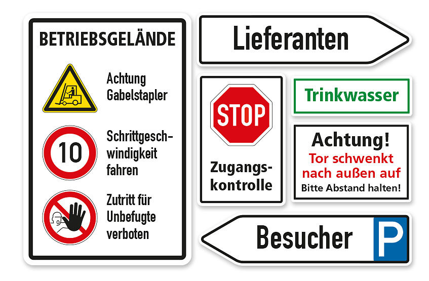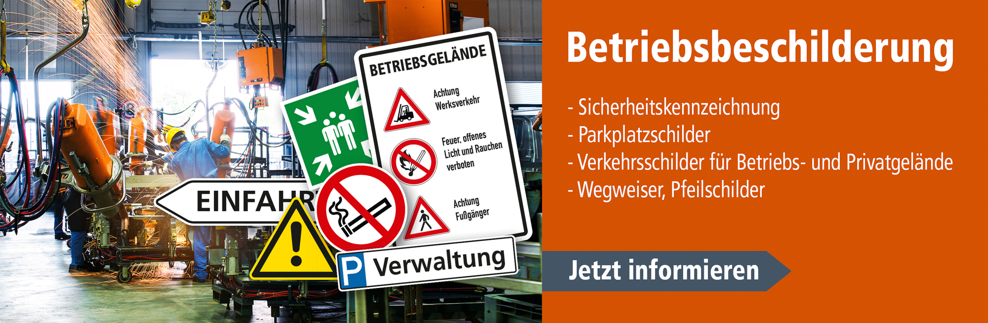 Ein weiterer Produktionsschwerpunkt in unserem Hause ist die Betriebsbeschilderung und Sicherheitskennzeichnung. So fertigen wir Parkplatzschilder, Unternehmensschilder und die gängigsten Verkehrsschilder nach StVO für Betriebsgrundstücke und private Liegenschaften als auch sicherheitsrelevante Hinweise in Form von nach ASR A1.3, BGV A8 oder DIN EN ISO 7010 genormten oder praxisorientierten Verbotsschildern, Gebotsschildern, Warnhinweisen sowie Fluchtweg- und Brandschutzschildern. Diese Sicherheitsschilder sind als Einzelzeichen oder Kombinationsschilder erhältlich.