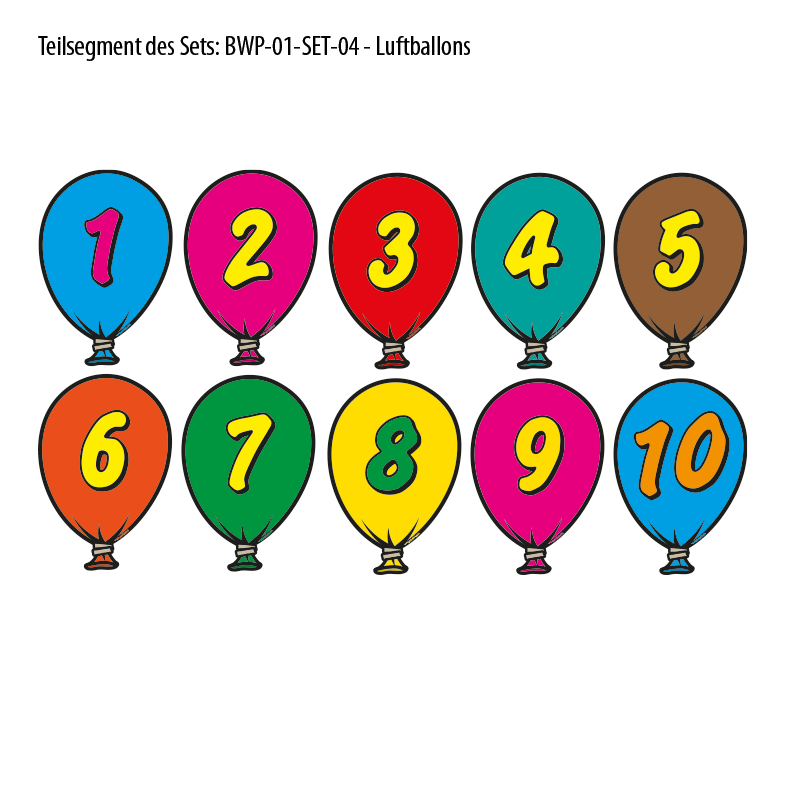 Ausreichende Bewegung trägt erheblich zu einer gesunden körperlichen und geistigen Entwicklung von Kindern bei. Leider verbringen Kinder mittlerweile viel Zeit mit Fernsehen, Online-Spielen und Spielkonsolen. Auch bestimmt der Computer schon vielfach den kindlichen Alltag – wichtige Bewegungszeit geht durch den Gebrauch dieser Medien verloren. Um diesen Defiziten entgegenzuwirken, ist es erforderlich, Kinder verstärkt zur Bewegung zu animieren – im Kreise der Familie, auf Spielplätzen, aber auch schon in Kindergärten und Grundschulen sollte auf eine Bewegungsförderung besonderer Wert gelegt werden. Bewegungspfade helfen bei dieser Aufgabe, sie regen Kinder an, sich spielerisch zu bewegen und unterstützen positiv ihre motorische Entwicklung. Unsere mehrteiligen Bewegungspfad-Sets für den Innenbereich sind in kindgerechten Ausführungen als Wand- oder Bodenkleber zur Selbstverklebung erhältlich, sie sind mit anderen Sets kombinierbar und können mit ebenfalls erhältlichen Einzelelementen einfach verlängert werden. So lassen sich auch umfangreiche, ineinander verwundene und sehr lange Bewegungspfade in großen Bereichen problemlos verwirklichen. Merkmale dieses Set-Artikels Farbige Luftballons mit Zahlen - Bewegungspfad-Set - BWP-01-SET-04:   Material:  Hochleistungs-Vynil-Folie, Stärke 0,1 mm, transparentes, rutschfestes (DIN 51130, Klasse R9) Polycarbonat-Schutzlaminat, Stärke 0,125 mm  Schwer entflammbar nach DIN EN 15501-1  Größe:   Luftballons: ca. 24 x 35 cm (Breite x Höhe) mit Zahlen 1-10 in diversen Farben – je Zahl 1 Stück - gesamt 10 Stück     Gesamtgröße: ca. 24 x 390 cm (Breite x Höhe) bei einer gradlinigen Verklebung und Segmentabständen von 40 cm (Segmentmitte zur Segmentmitte) wie unser Artikelbild Verarbeitung: formgeschnitten  Verpackungseinheit: 10-teiliges Aufkleberset zur Selbstverklebung, 1 x Kaschierrakel, Informationen zur Verklebung im Karton  Einsatzbereiche: Innenanwendung – Flure und freie Bereiche in Kindergärten, Schulen und Freizeiteinrichtungen  Bitte beachten Sie: Unsere langlebigen Bodenkleber für Bewegungspfade sind für alle glatten Böden (gegossen oder fest mit dem Untergrund verbunden) im Innenbereich geeignet. Für eine optimale Haftung ist es erforderlich, dass die Untergründe frei von jeglichen Trennmitteln sind wie Staub, Schmutz, Fett und Wachs. Bitte reinigen Sie daher vor der Montage die Böden mit geeigneten Reinigungsmitteln.  Die Planung umfangreicher Bewegungspfade kann kompliziert sein, insbesondere ohne die Möglichkeit, alle Pfadmotive in ihrer Anordnung zu überblicken. Für diesen Fall stellen wir Ihnen unsere Planungs-PDF-Dateien zur Verfügung, in den unsere Bewegungspfad-Sets sowie einige Sondermotive im Maßstab 1:10 abgebildet sind. Sofern diese PDF-Daten 1:1 ausgedruckt werden und Sie einen geeigneten Untergrund (z.B. Zeichenkarton) mit dem Aufriss Ihrer Räumlichkeiten im gleichen Maßstab 1:10 angefertigt haben, können Sie die ausgedruckten Motive grob ausschneiden, auf Ihrem Untergrund beliebig hin und her schieben und für eine dauerhafte Planungsübersicht mit einem Klebestift fixieren. Diese analoge Vorgehensweise ist simpel und ermöglicht zugleich, auch mehreren Personen an der Planung mitzuwirken. Die Montage unserer Bewegungspfade ist einfach und kann auch von Ungeübten ohne Probleme sicher ausgeführt werden. Sollten Sie dennoch bei der Montage einen Bodenkleber falsch kleben oder beschädigen, bitten wir um Verständnis, dass wir keinen kostenlosen Ersatz leisten. Alle Einzelelemente eines Sets können auch als Einzelaufkleber erworben werden – zur Erweiterung Ihres Pfades oder als Ersatz bei Beschädigungen.  Weitere Informationen zum Set und zur Montage können Sie im PDF-Format weiter unten unter "Verfügbare Downloads" oder über unseren Download-Bereich unter "Bewegungspfade" aufrufen. Über unseren Download-Bereich können Sie auch unsere Planungs-PDF-Dateien aufrufen.