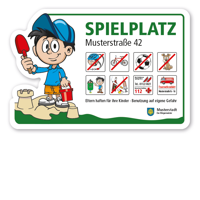 - Bitte beachten Sie, dass konfigurierte Spielplatzschilder individuelle Artikel sind. Ein Rückgaberecht ist ausdrücklich ausgeschlossen.