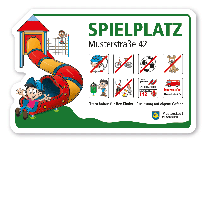 - Bitte beachten Sie, dass konfigurierte Spielplatzschilder individuelle Artikel sind. Ein Rückgaberecht ist ausdrücklich ausgeschlossen.