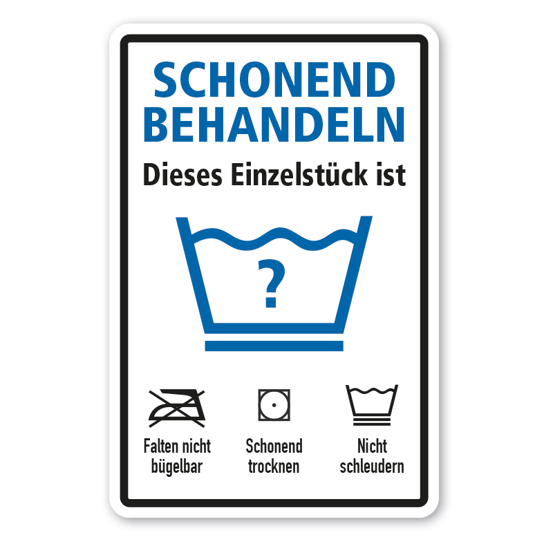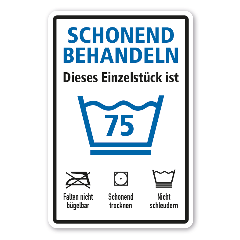 Originelles Geburtstagsschild im Waschanleitungsformat. Dieses Fun-Schild kommt auf Geburtstagspartys und beim Geburtstagskind immer gut an. Merkmale des lustigen Geburtstagsschildes Schonend behandeln - Dieses Einzelstück ist - mit Ihrer Zahl und Wunschtext - Variante 02 – FUN-T-72: Material: Aluminium 2 mm Ausführung: standard weiß. Alternative Ausführungen sind möglich. Abmessungen: 300 x 200 mm 450 x 300 mm 600 x 400 mm (bewährte Standardgröße – wird empfohlen) 750 x 500 mm 900 x 600 mm Verarbeitung: rechteckig beschnitten mit abgerundeten Ecken Verpackungseinheiten: 1 Fun-Schild Bitte beachten Sie: Dieses originelle Fun-Schild kann nur mit individuellen Attributen bestellt werden. Geben Sie Ihren Wunschtext in das Eingabefeld auf dieser Seite ein. Nach Ihrer Bestellung setzen wir Ihre Wünsche um und übermittelt Ihnen eine Korrekturdatei zur Ansicht. Bitte prüfen Sie die Inhalte dieser Korrektur auf Fehler und erteilen uns, sofern alles in Ordnung ist, unbedingt die Druckfreigabe. Ihr Schild kann erst dann produziert werden, wenn uns Ihre Druckfreigabe vorliegt. Schilder mit Text- und Zeichenänderungen oder nach Ihrer Vorgabe gelocht sind individuelle Schilder und somit grundsätzlich vom Rückgaberecht ausgeschlossen.