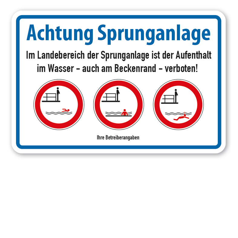 Merkmale des Hinweisschildes / Verbotsschildes Achtung Sprunganlage - Im Landebereich der Sprunganlage ist der Aufenthalt im Wasser - auch am Beckenrand - verboten – mit Ihren Betreiberangaben - VBT-249-K: