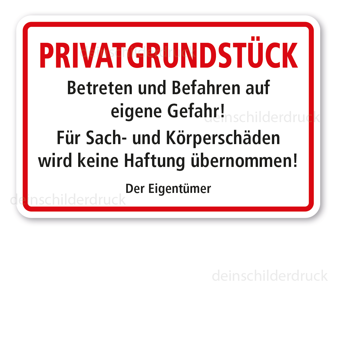 Produktinformationen "Hinweisschild Privatgrundstück - Betreten und Befahren auf eigene Gefahr. Für Sach- und Körperschäden keine Haftung"