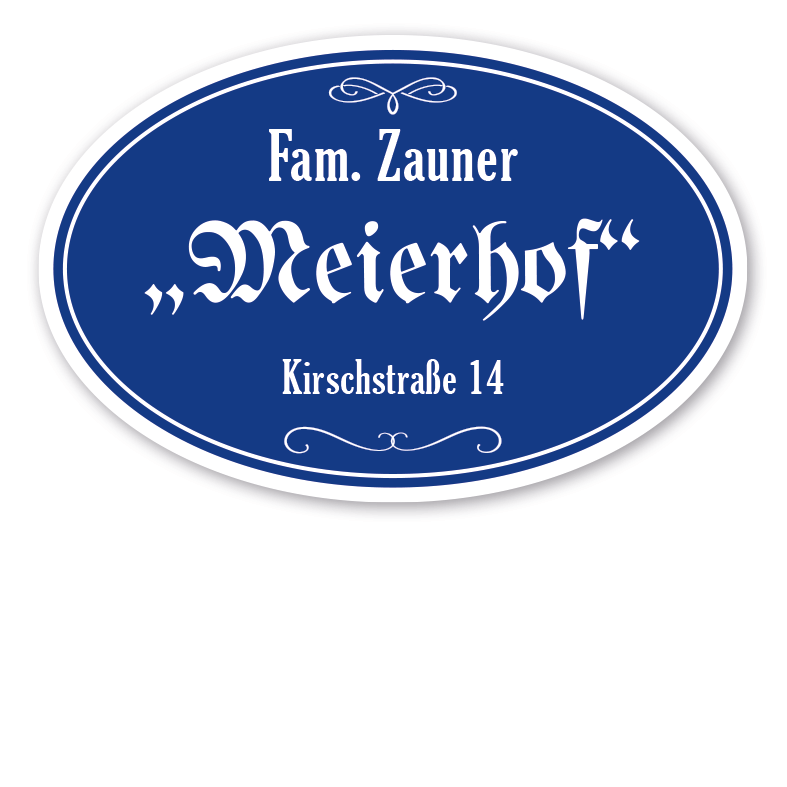 Merkmale des Hofschildes / der Hoftafel mit Familien- und Hofnamen sowie Adresse - ovale Ausführung in vier Farbvarianten - HF-TF-01: