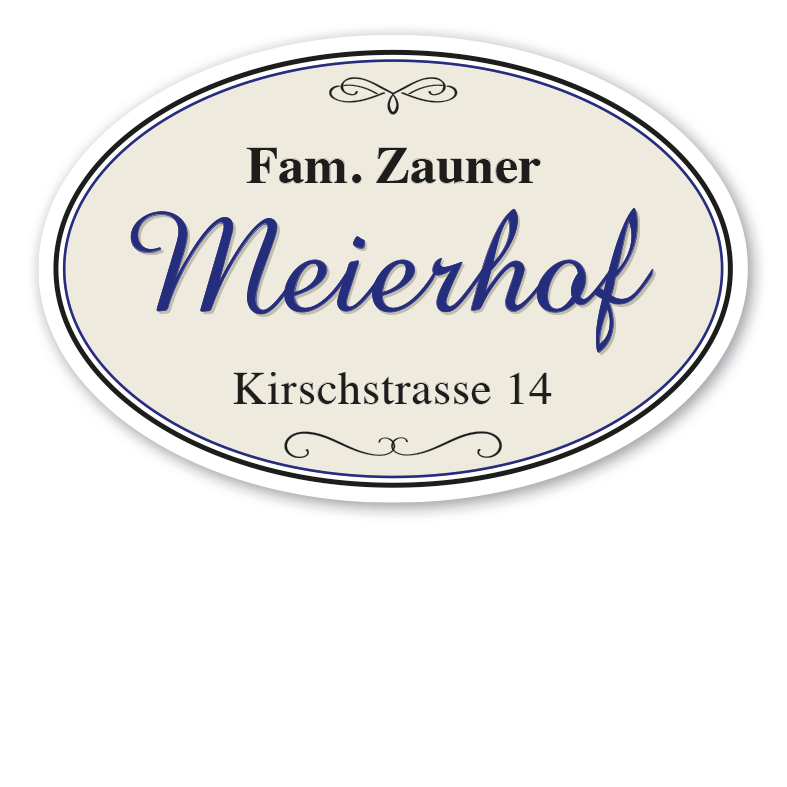 Merkmale des Hofschildes / der Hoftafel mit Familien- und Hofnamen sowie Straßenangabe - ovale Ausführung in drei Farbvarianten - HF-TF-10: