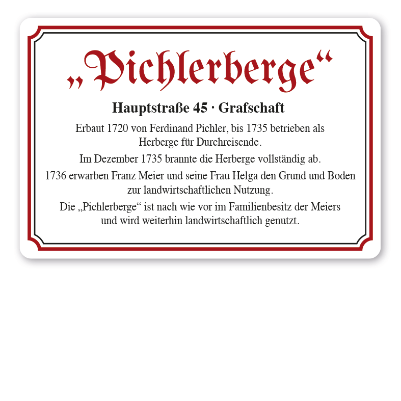 Viele Bauernhöfe und landwirtschaftliche Betriebe werden seit vielen Generationen betrieben – sie haben eine Geschichte, die manchmal Jahrhunderte zurückreicht. Mit unseren hochwertigen Hoftafeln, die meistens am Haus befestigt werden, und den historischen Fakten Ihres Hofes, leisten Sie einen wertvollen Beitrag zur Heimatkunde Ihres Ortes. Unsere Hoftafeln werden aus 2 mm Hartaluminium oder aus 3 mm Aluminium-Verbundmaterial gefertigt, sie sind wetterfest und in vielen Größen erhältlich.