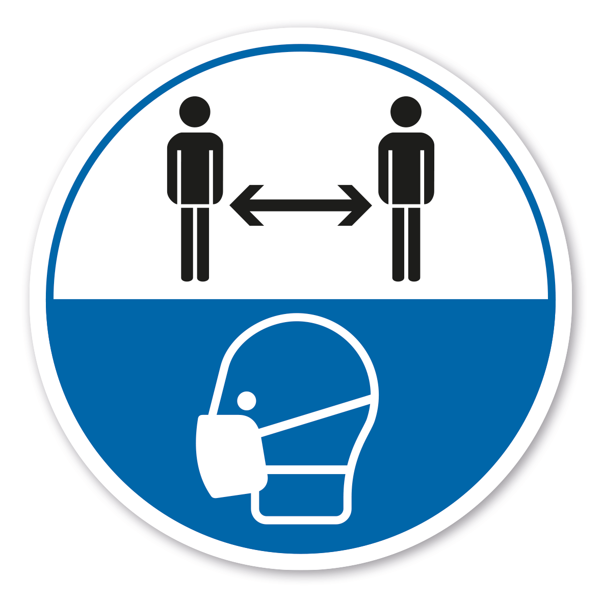 Hygienehinweis Abstand halten - mit Schutzmaskensymbol - als Schild im Außen- oder Innenbereich, Aufkleber für Wände und Türen oder als strapazierfähige Bodenkleber mit rutschfestem Schutzlaminat für hochfrequentierte Zonen im Mitarbeiter- und Kundenverkehr – als Warnmarkierung für z.B. Verkaufsräume, Ladenzeilen, öffentliche Einrichtungen und Verwaltungsgebäude, Wartezonen, Labore, Gewerbeobjekte und andere Bereiche mit erhöhter Infektionsgefahr, in denen es auf eine konsequente Distanzeinhaltung zu anderen Personen oder andere gesundheitsrelevante Informationen ankommt.