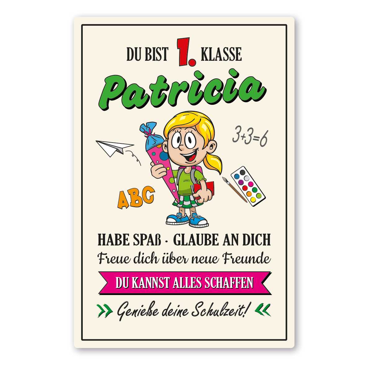 Merkmale des individuellen Schildes für Erstklässler zur Einschulung - Du bist 1. klasse - mit Ihrem Wunschnamen und aufmunternden Aussagen in zwei Ausführungen – FUN-ESL-02