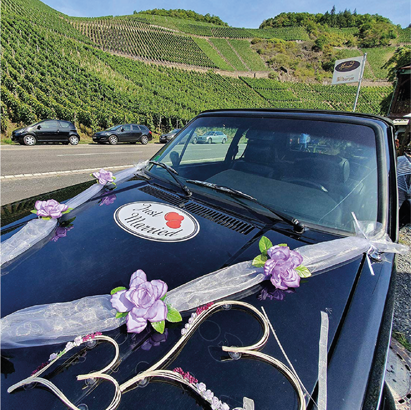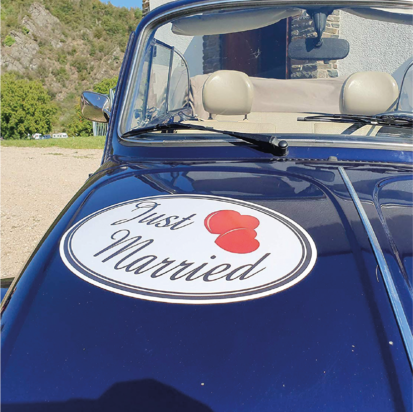 Merkmale des Formstückes Just Married zur Dekoration von Hochzeitsfahrzeugen: