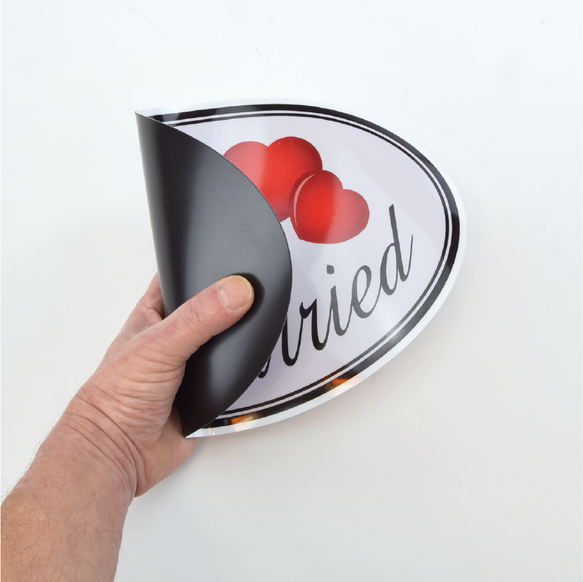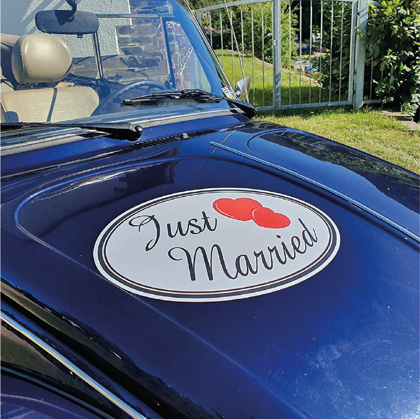 Magnetisch haftendes Formstück Just Married für den großen Tag. Haften Sie diese Magnetfolie oder mehrere auf Ihr Fahrzeug und zeigen Sie so allen, dass Sie sich "getraut" haben. Magnetische Just Married-Magnetfolien haften auf allen ferromagnetischen (eisenhaltigen) Oberflächen, sie lassen sich jederzeit anbringen und wieder rückstandslos entfernen, was eine flexible Nutzung ermöglicht. Unsere hochwertigen, in Deutschland gefertigten Magnetfolien sind langlebig und leicht zu reinigen.