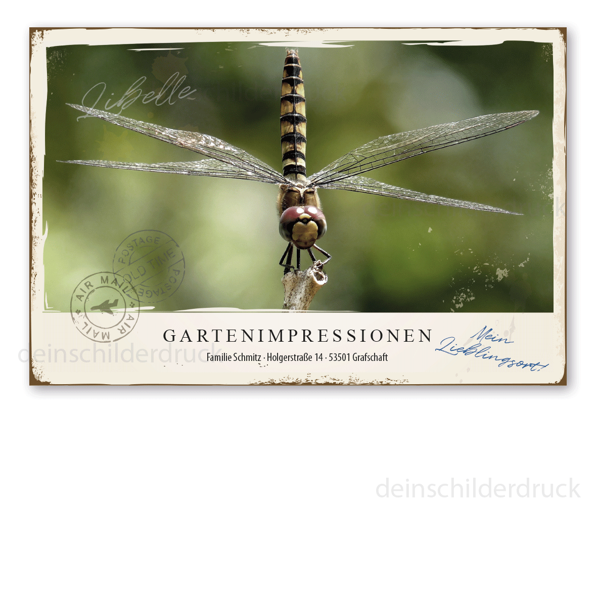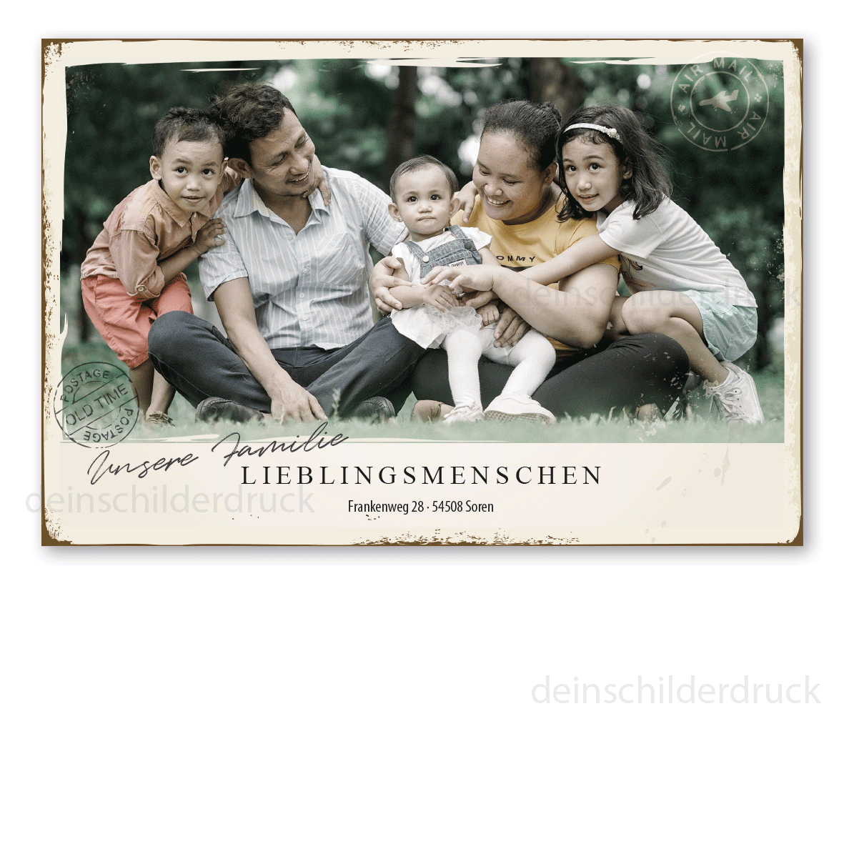 - Dieses originelle Postkartenschild kann nur mit individuellen Attributen bestellt werden. Laden Sie Ihr Bild über den Konfigurator auf dieser Seite auf unseren Server. Stellen Sie zuvor unbedingt sicher, dass Ihr Wunschbild hoch aufgelöst ist bzw. in den Abmessungen mindestens der gewünschten Schildergröße entspricht. Ein Foto, das mit einem aktuellen Smartphone aufgenommen wurde, ist in der Regel gut geeignet. Ändern Sie nichts an den Farben, dies wird von uns erledigt.