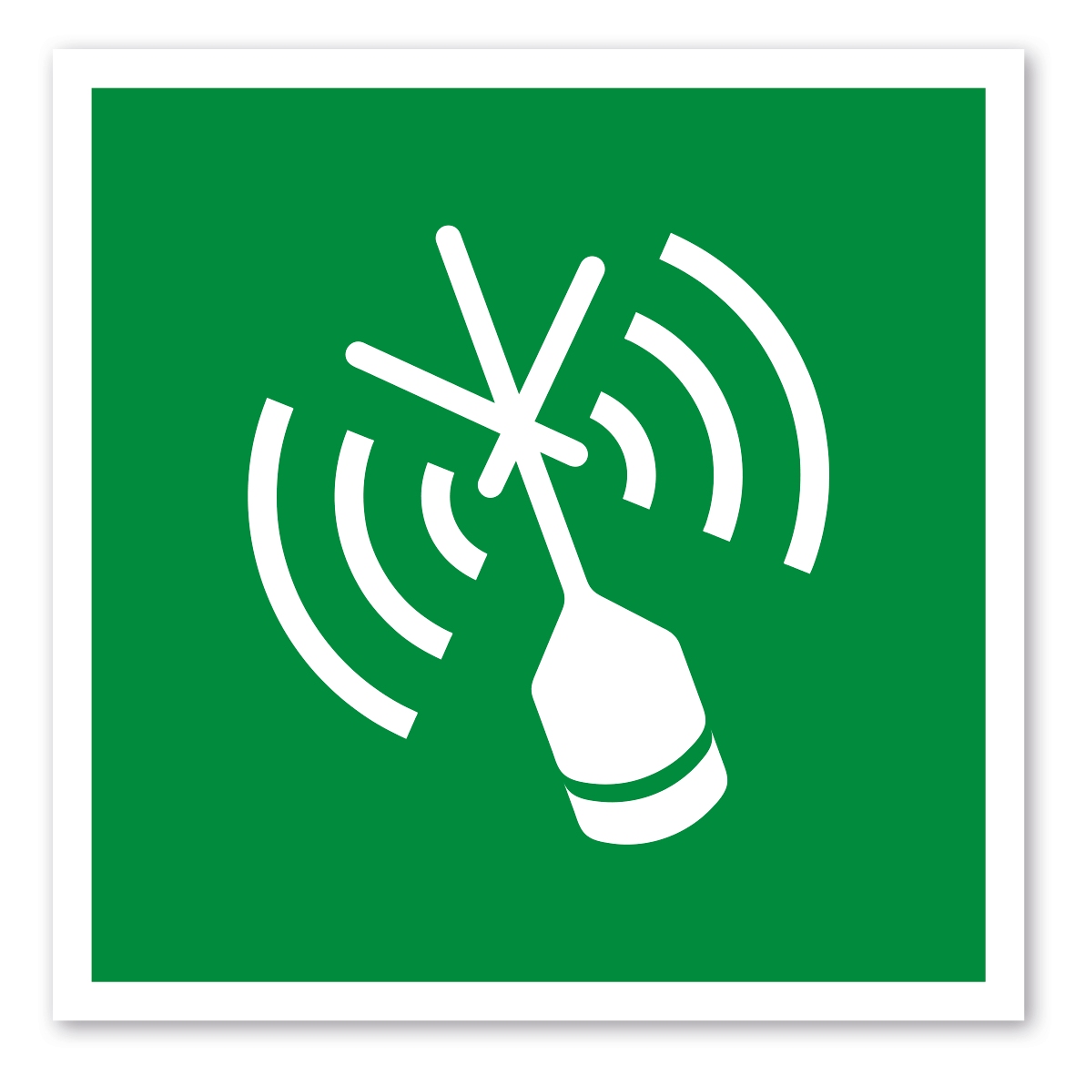 Rettungszeichen Funksender zur Lokalisierung von Schäden – nach ISO 7010 und ASR A 1.3 (2013) – Sicherheitskennzeichnungs für Schiffe und Boote.