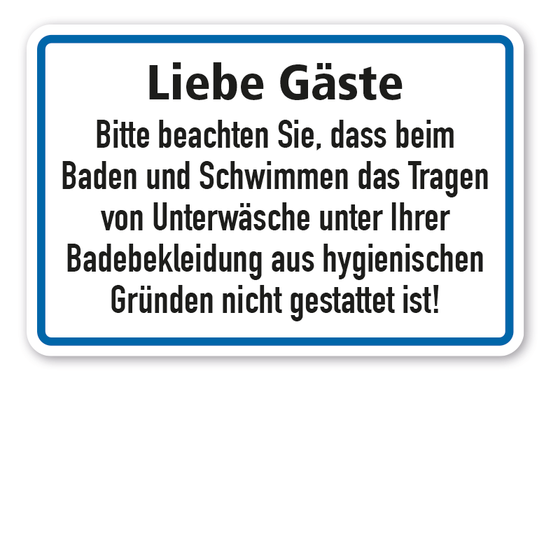 Schild Liebe Gäste - Bitte beachten Sie, dass beim Baden und Schwimmen das Tragen von Unterwäsche unter Ihrer Badebekleidung aus hygienischen Gründen nicht gestattet ist. In diversen Größen erhältlich, auch mit Ihrem Wunschtext.