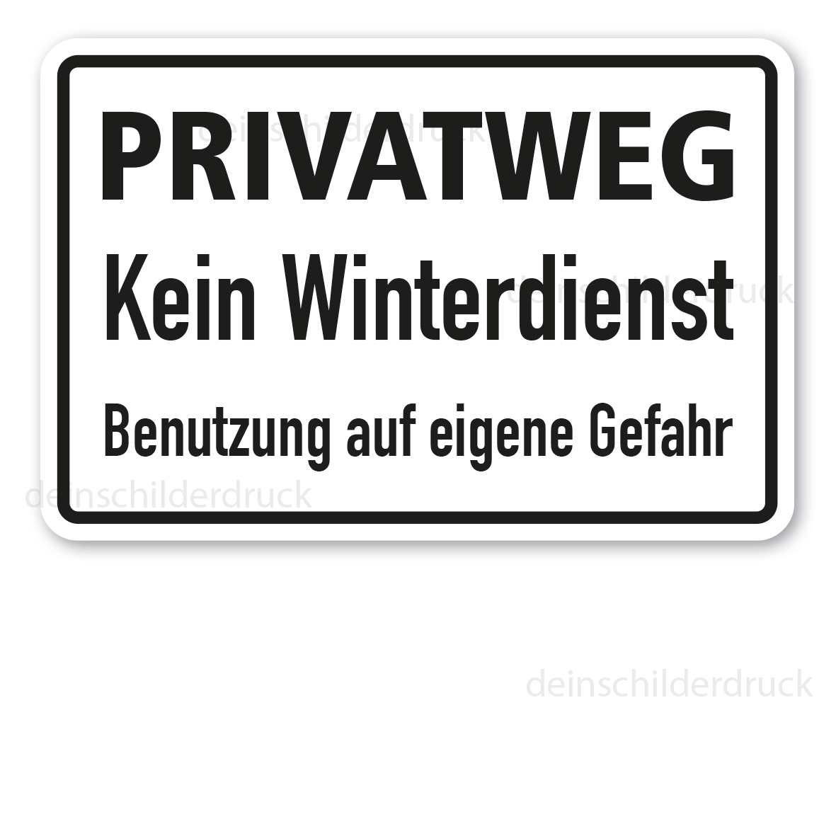 Schild Privatweg - Kein Winterdienst - Benutzung auf eigene Gefahr. Textschilder sind Hinweisschilder mit reinen Textinhalten in zahlreichen Größen und Ausführungen. Sie können als Standardschilder für diverse Themenbereiche oder in individuellen Ausführungen für eine bedarfsbezogene Beschilderung erworben werden.
