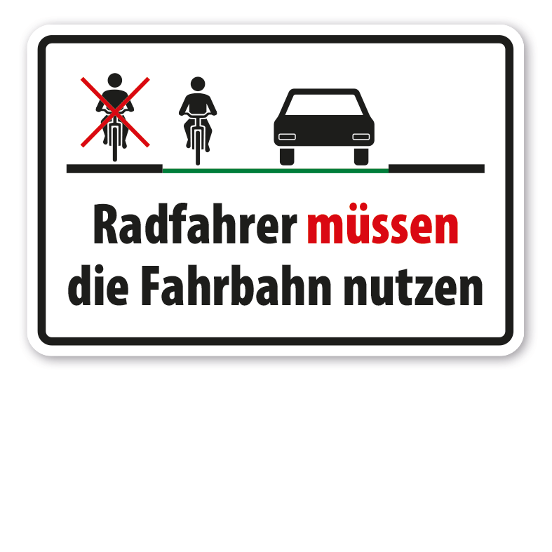 Schild Radfahrer müssen die Fahrbahn nutzen. Diese Schild ist in diversen Größen erhältlich – auch mit Ihren individuellen Inhalten für eine bedarfsbezogene Beschilderung.