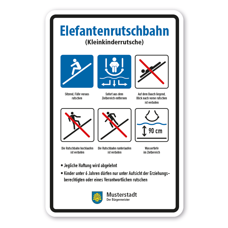 Schild für Wasserrutschen - Elefantenrutschbahn - Rutschanleitung - nach EN 1069 – Hinweise und Verhaltensregeln für Wasserrutschen als Kombinationsschild mit individueller Zeichen- und Textwahl. Unsere Kombinationsschilder für Wasserrutschen erfüllen mit der richtigen Wahl der Sicherheitszeichen und den benötigten Zusatzinformationen sowie Betreiberinformationen die Beschilderungsvorgaben nach EN 1069. Die vielfälltigen Individualisierungsmöglichkeiten erfüllen zudem auch alle Voraussetzungen für eine flexible, bedarfsbezogene Beschilderung Ihrer Wasserrutsche.