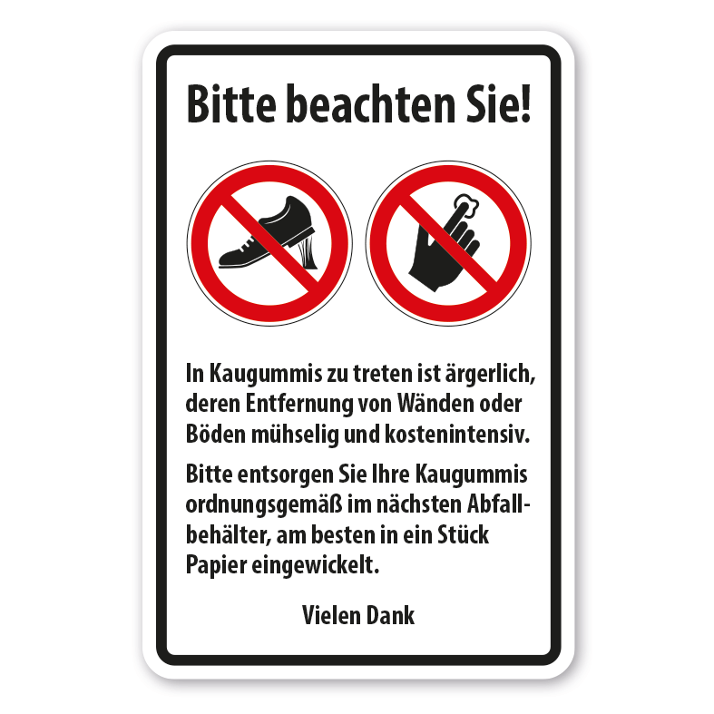 Verbotsschild Bitte beachten sie - In Kaugummis zu treten ist ärgerlich, deren Entfernung von Wänden oder Böden mühselig und kostenintensiv. Bitte entsorgen Sie Ihre Kaugummis ordnungsgemäß im nächsten Abfallbehälter, am besten in ein Stück Papier eingewickelt. mit zwei Verbotszeichen und Zusatztext. Kombinationsschilder beinhalten genormte oder praxisbewährte Verbotszeichen mit Textinhalten, um Missverständnisse zu vermeiden bzw. bestimmte Verbotsanweisungen näher zu erläutern, die nur von Verbotsszeichen eventuell nicht eindeutig vermittelt werden. Mit einem Kombinationsschild, dem richtigen Verbotszeichen und einem aussagekräftigen Text beugen Sie jeglicher Fehlinterpretation des Verbotsschildes eindeutig vor.