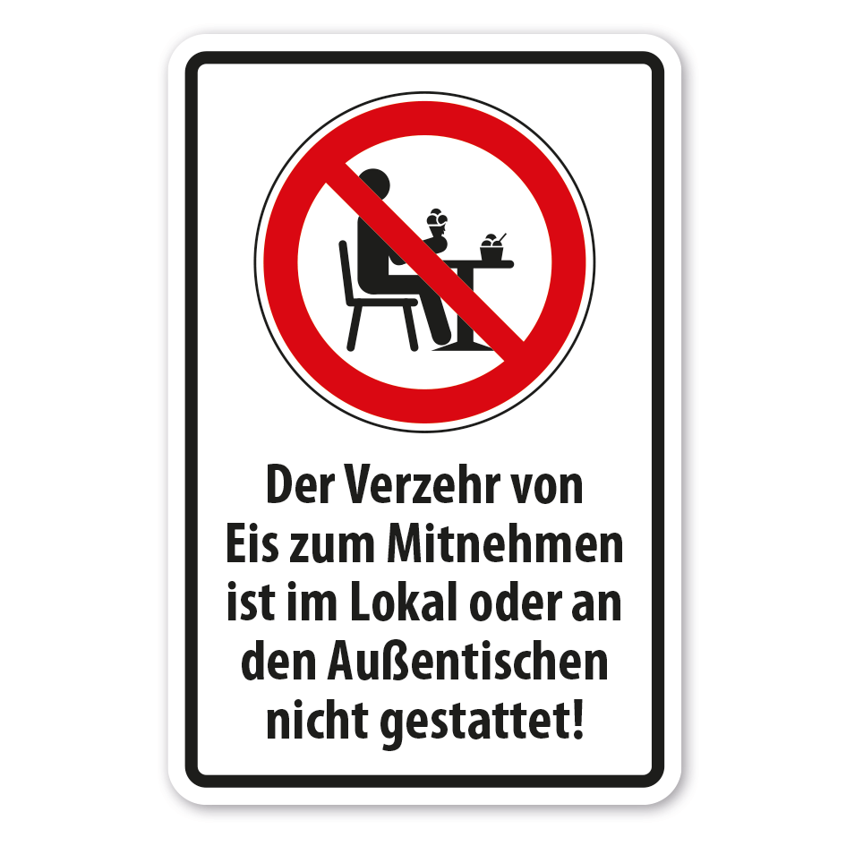 Verbotsschild Der Verzehr von Eis zum Mitnehmen ist im Lokal oder an den Außentischen nicht gestattet. Dieses Schild ist in diversen Größen erhältlich, auch mit Ihrem Wunschtext.