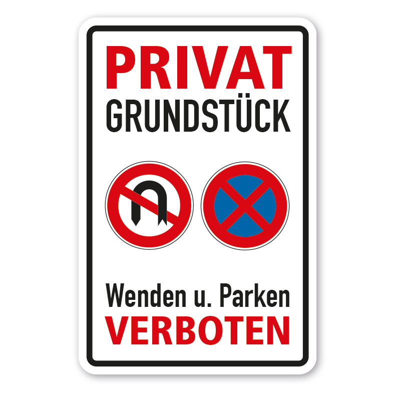 Verbotsschild - Privatgrundstück - Wenden und Parken verboten als Kombinationsschild mit Verkehrszeichen und Zusatztext. Kombinationsschilder sind Schilder mit einem Verkehrszeichen nach StVO oder einem praxisbewährten Zeichen sowie ergänzenden Textinhalten, die unterhalb der Verkehrszeichen angeordnet sind. Aufgrund dieser Kombination und auch der Möglichkeit, bestehende Inhalte zu verändern, erfüllen Kombinationsschilder alle Anforderungen, um eine flexible, individuelle Beschilderung sicherzustellen. Wir führen zahlreiche Kombinationsschilder für die betriebliche oder kommunale Beschilderung in vielen Schildervarianten in standardisierten oder individuellen, an Ihre Bedürfnisse angepassten Ausführungen.