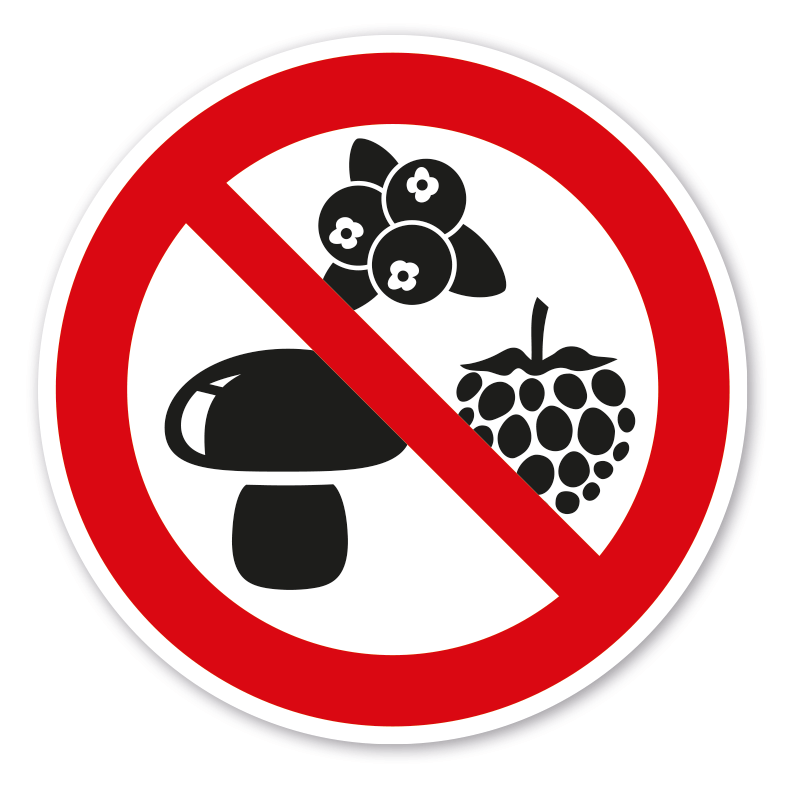 Verbotszeichen Pilze und Beeren sammeln verboten. Verbotszeichen weisen in der Regel darauf hin, dass ein bestimmtes Verhalten verboten ist, um eine Gefährdung von Personen oder Maschinen abzuwenden oder dass bestimmte Handlungen aus anderen Gründen unerwünscht sind.