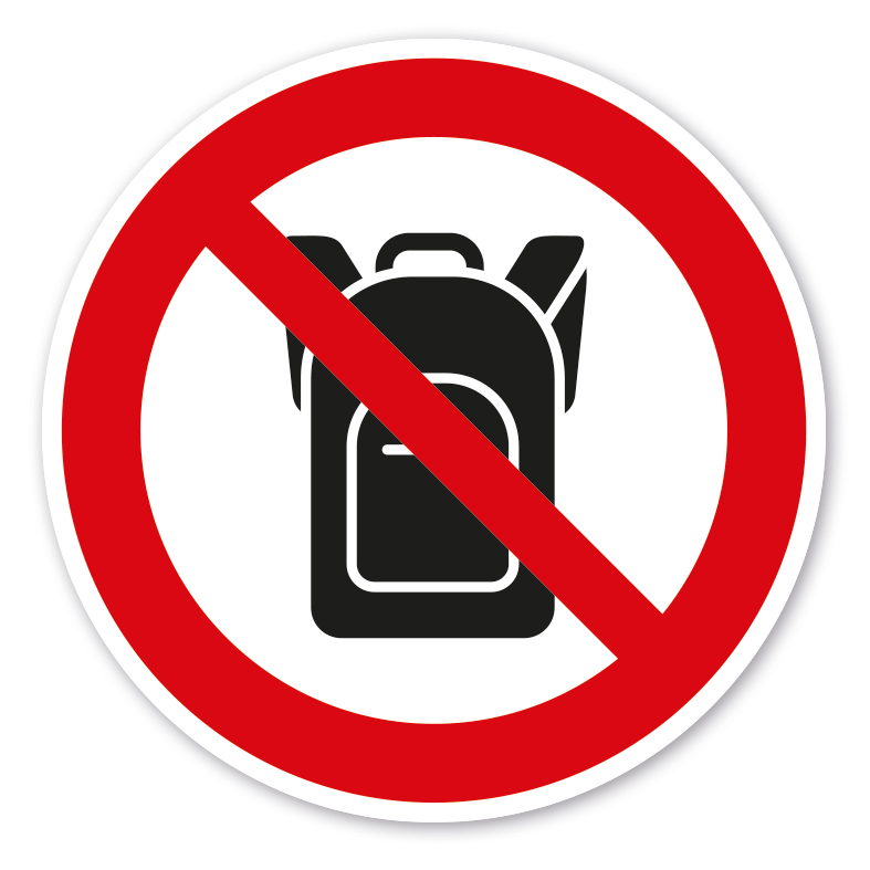 Verbotszeichen Rucksäcke - Taschen verboten. Verbotszeichen weisen in der Regel darauf hin, dass ein bestimmtes Verhalten verboten ist, um eine Gefährdung von Personen oder Maschinen abzuwenden oder dass bestimmte Handlungen aus anderen Gründen unerwünscht sind.