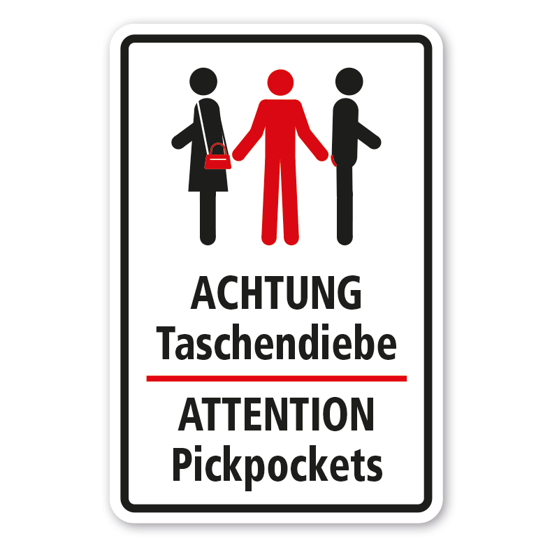 Warnschild Achtung Taschendiebe - Attention Pickpockets. Zur Kennzeichnung von belebten Plätzen und Orten. Unsere Hinweisschilder sind in zahlreichen Größen und Ausführungen erhältlich. Sie können als Standardschilder oder in individuellen Ausführungen für eine bedarfsbezogene Beschilderung erworben werden.