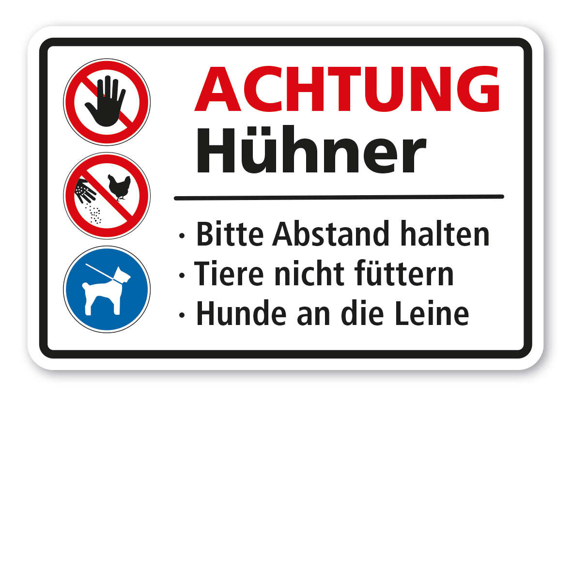 Weideschild Achtung Hühner - Bitte Abstand halten - Tiere nicht füttern - Hunde an die Leine – mit Verbots- und Gebotssymbolen