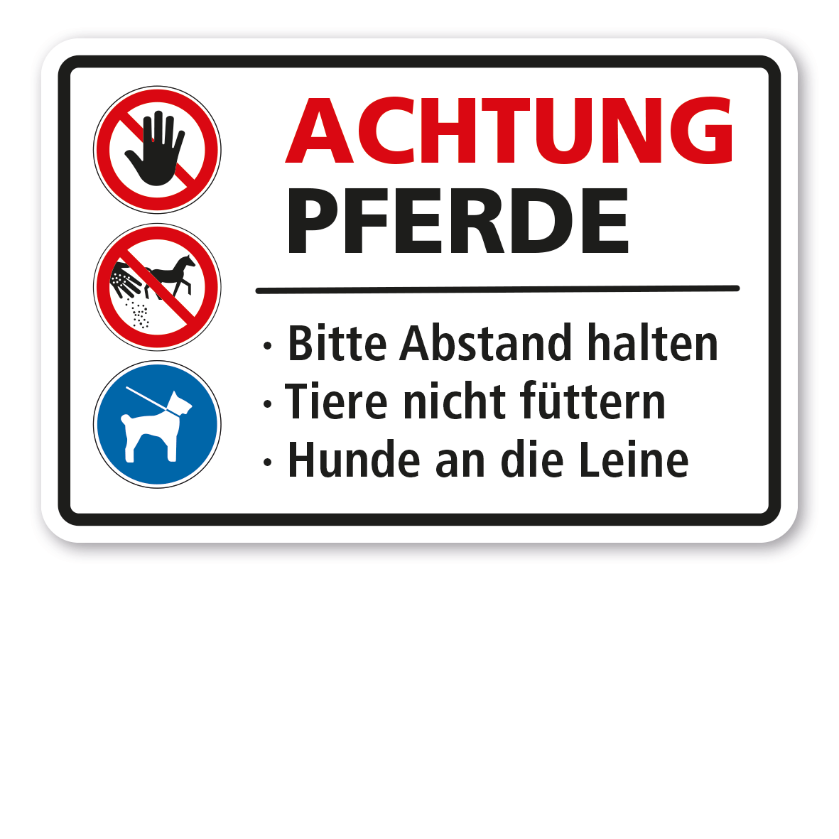 Produktinformationen "Weideschild Achtung Pferde - Bitte Abstand halten - Tiere nicht füttern - Hunde an die Leine – mit Verbots- und Gebotssymbolen"