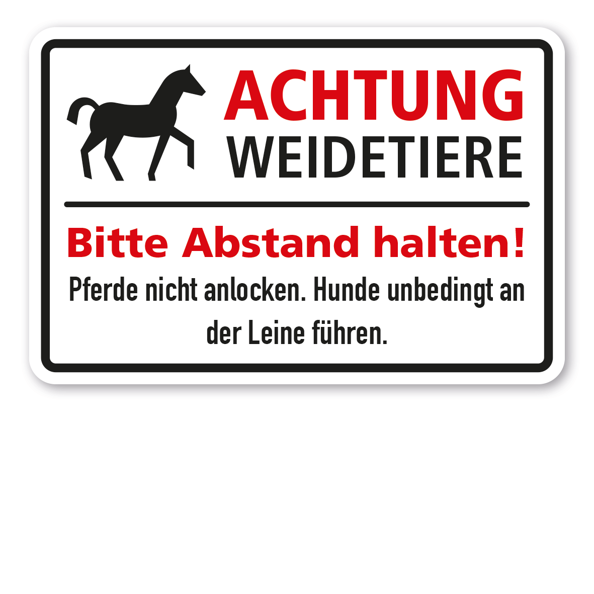 Produktinformationen "Weideschild Achtung, Weidetiere (Pferd) - Bitte Abstand halten! Pferde nicht anlocken. Hunde unbedingt an der Leine führen"