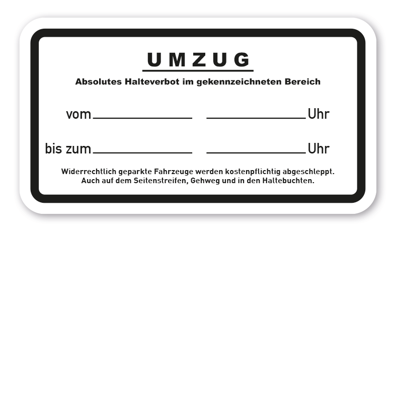 Praxisbewährtes Zusatzzeichen für Verkehrsschilder Umzug - Absolutes Halteverbot im gekennzeichneten Bereich VZ-61. Zusatzzeichen werden in der Regel mit Verkehrsschildern kombiniert und konkretisieren die bildlichen Aussagen dieser in Form von reinen Texthinweisen, Texthinweisen mit weiteren Symbolen oder nur Symbolen. Zusatzzeichen oder Zusatzverkehrsschilder sind als Standardschilder nach StVO erhältlich oder als Sonderschilder mit individuellen Textinhalten oder Symbolen für die bedarfsbezogene Nutzung.