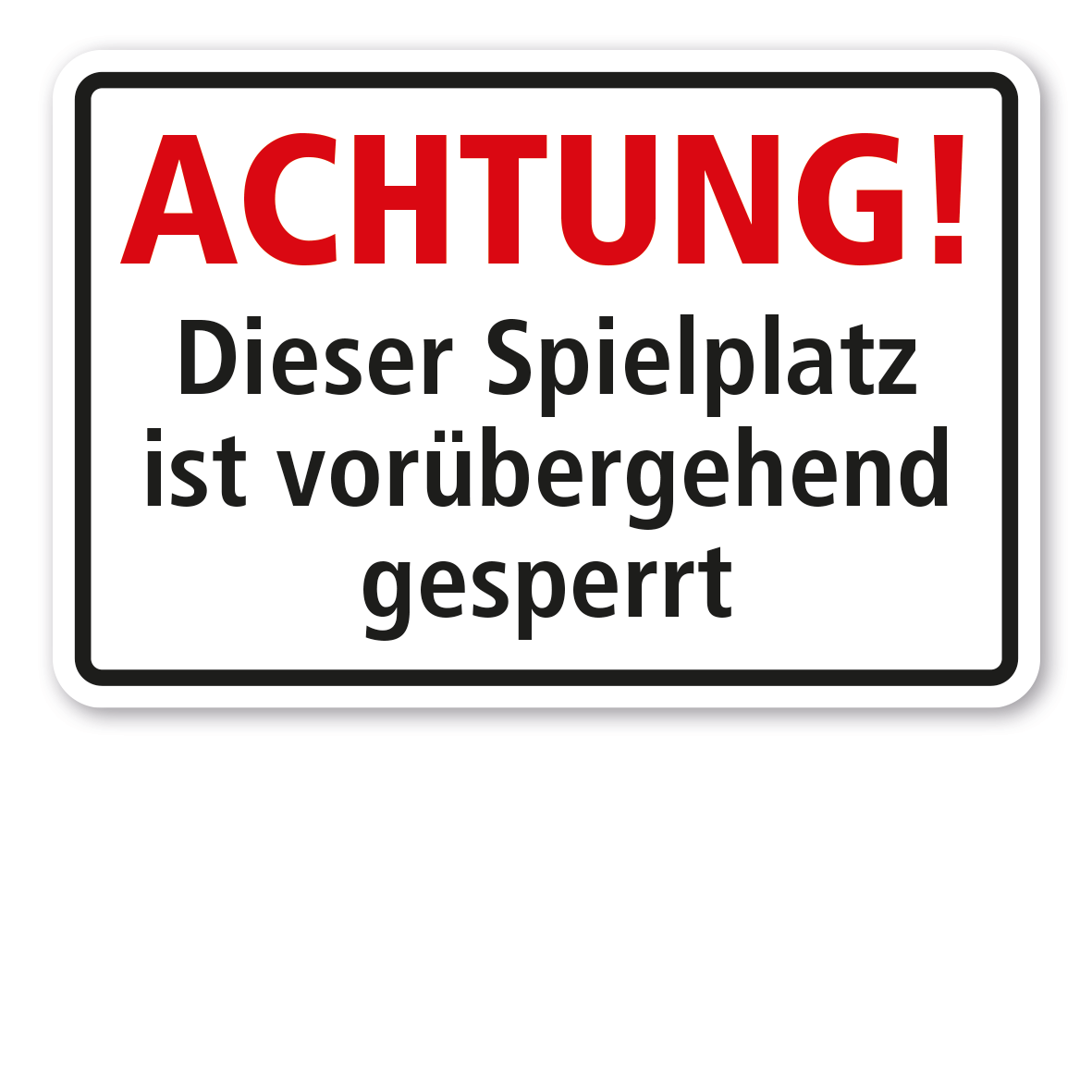 Hinweisschild / Spielplatzschild Achtung - Dieser Spielplatz ist vorübergehend gesperrt. Zur Kennzeichnung von für den Spielbetrieb gesperrten Spielplätzen. Textschilder sind Hinweisschilder mit reinen Textinhalten in zahlreichen Größen und Ausführungen. Sie können als Standardschilder für diverse Themenbereiche oder in individuellen Ausführungen für eine bedarfsbezogene Beschilderung erworben werden.