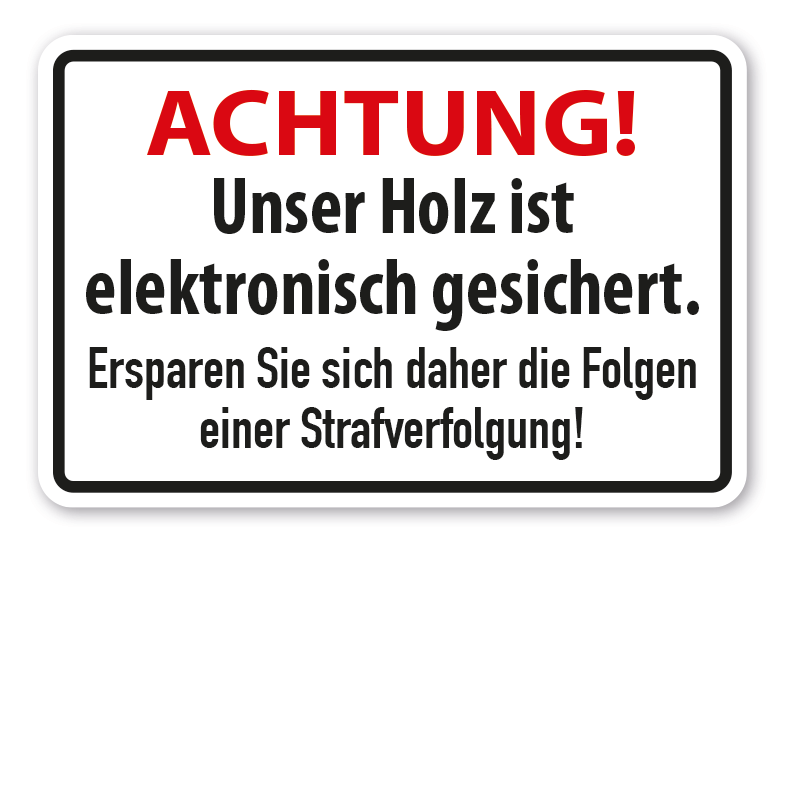 Hinweisschild Achtung - Unser Holz ist elektronisch gesichert. Ersparen Sie sich daher die Folgen einer Strafverfolgung. Dieses Forstschild diversen Größen und Ausführungen erhältlich.
