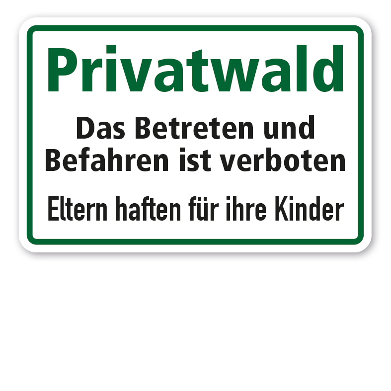 Hinweisschild Privatwald - Das Betreten und Befahren ist verboten - Eltern haften für ihre Kinder. Dieses Forstschild ist diversen Größen und Ausführungen erhältlich.
