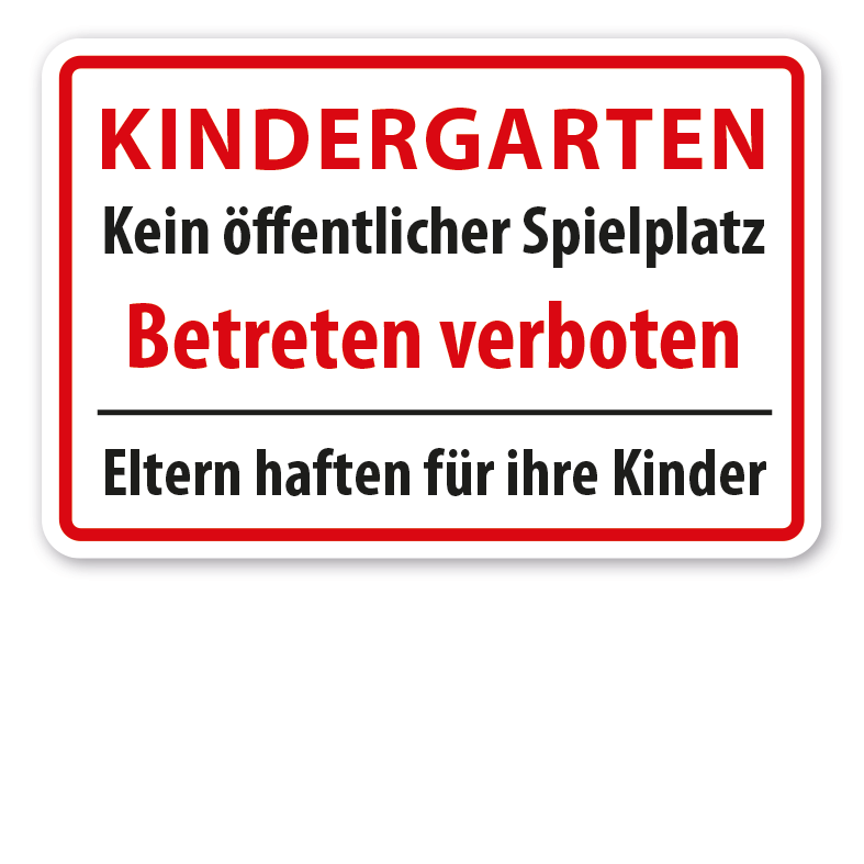 Hinweisschild / Spielplatzschild Kindergarten - Kein öffentlicher Spielplatz - Betreten verboten - Eltern haften für ihre Kinder. Zur Kennzeichnung von privat betriebenen Spielplätzen. Textschilder sind Hinweisschilder mit reinen Textinhalten in zahlreichen Größen und Ausführungen. Sie können als Standardschilder für diverse Themenbereiche oder in individuellen Ausführungen für eine bedarfsbezogene Beschilderung erworben werden.