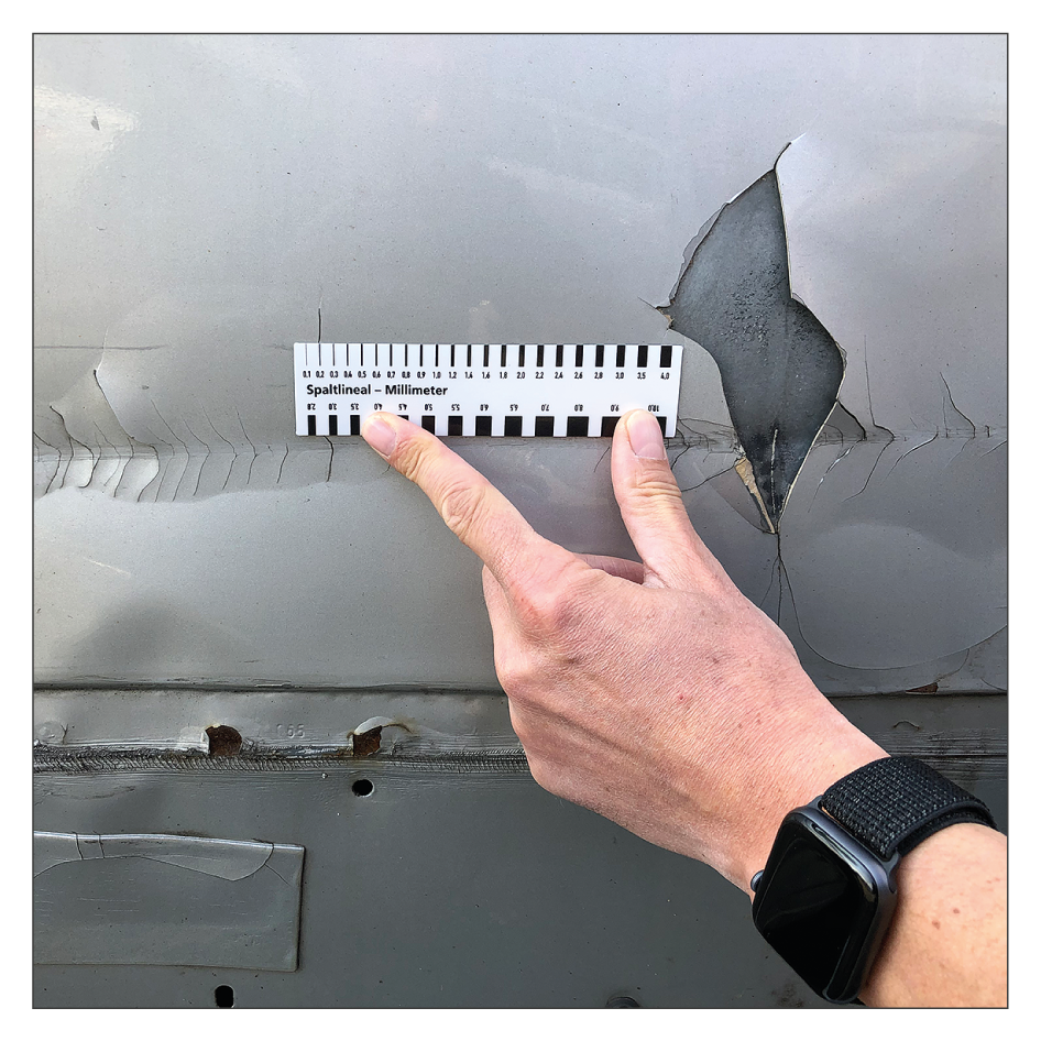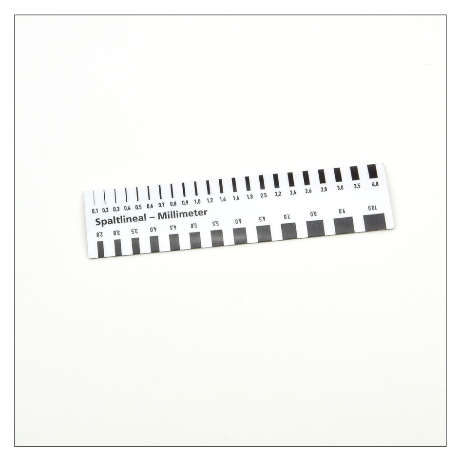 Spaltlineal für Sachverständige, KFZ-Gutachter, Präsentationen. Eine magnetische Fotomesskarte mit Spaltbreiten ist eine praktische Lösung für die fotografische Darstellung von Kleinschäden (Vorschäden oder bei Rücknahmegutachten). Durch die Nutzung des Lineals entfällt eine nachträgliche, aufwändige Bildbearbeitung, die Authentizität der Fotos bleibt im vollen Umfang erhalten, eine Dokumentation von Beschädigungen ist jederzeit nachvollziehbar. Unsere hochwertigen, in Deutschland gefertigten Spaltlineale haften auf allen ferromagnetischen (eisenhaltigen) Oberflächen, sie sind biegsam und lassen sich leicht reinigen.