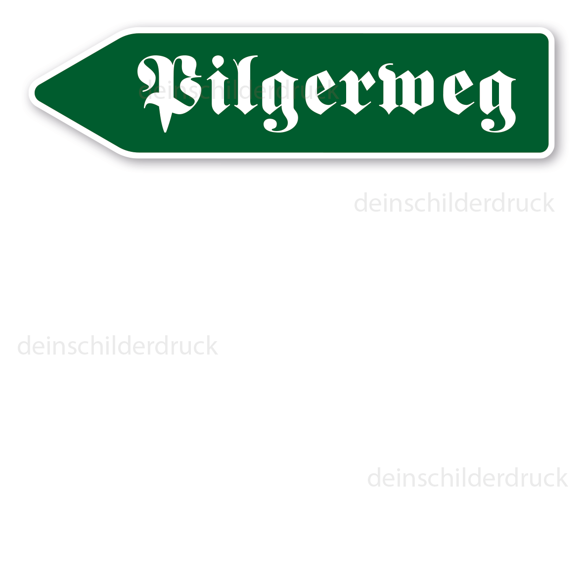Hinweisschild Pilgerweg in Pfeilform. Pfeilschilder, auch Pfeilwegweiser genannt, sind mit Ihrer Pfeilform eine bewährte Orientierungshilfe für Pilger und Wanderer und führen mit den aufgedruckten Informationen sicher zum Ziel. Unsere Pfeilschilder sind als Standardartikel oder in individuellen, an Ihre Bedürfnisse angepassten Ausführungen in mehreren Farben und Größen erhältlich. Für eine bessere Sichtbarkeit können alle Pfeilwegweiser auch reflektierend ausgerüstet werden.