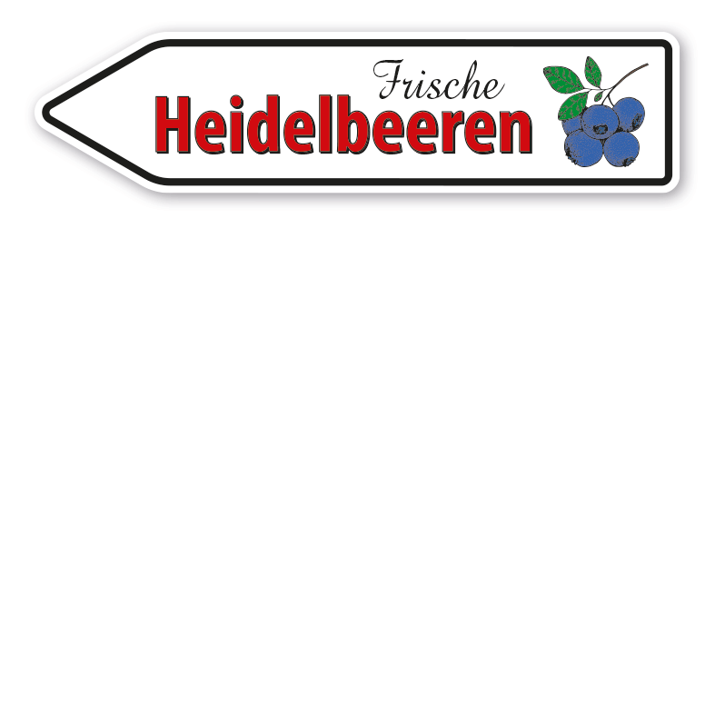 Pfeilschild / Verkaufsschild Frische Heidelbeeren – mit Abbildung Heidelbeeren als Hinweisschild zum Verkaufsstandort oder als Wegweiser zum Bauernhof. Dieser ansprechende und auffällige Verkaufwegweiser ist langlebig und bestens für den Außeneinsatz geeignet. Pfeilschilder, auch Pfeilwegweiser genannt, sind mit Ihrer Pfeilform eine bewährte Orientierungshilfe für Verkehrsteilnehmer und führen mit den aufgedruckten Informationen sicher zum Ziel. Unsere Pfeilschilder sind als Standardartikel oder in individuellen, an Ihre Bedürfnisse angepassten Ausführungen in mehreren Farben und Größen erhältlich. Für eine bessere Sichtbarkeit können alle Pfeilwegweiser auch reflektierend ausgerüstet werden.