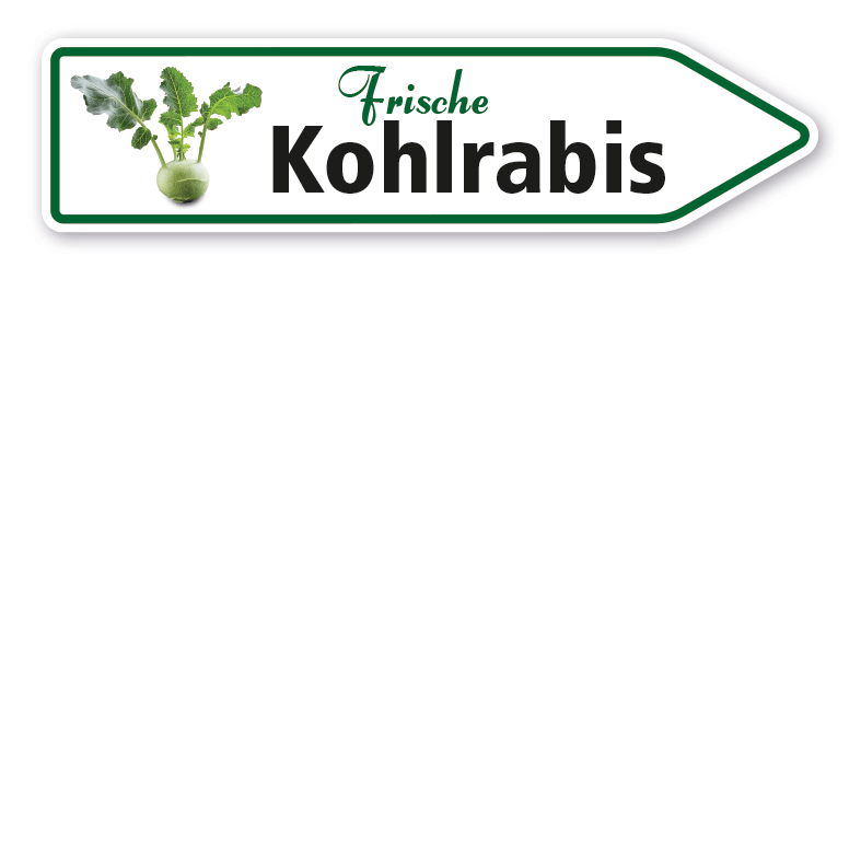 Pfeilschild / Verkaufsschild Frische Kohlrabis - Hofschild – mit Abbildung als Hinweisschild zum Verkaufsstandort – für Verkaufsstände oder als Wegweiser zum Bauernhof. Dieser ansprechende und auffällige Verkaufwegweiser ist langlebig und bestens für den Außeneinsatz geeignet. Pfeilschilder, auch Pfeilwegweiser genannt, sind mit Ihrer Pfeilform eine bewährte Orientierungshilfe für Verkehrsteilnehmer und führen mit den aufgedruckten Informationen sicher zum Ziel. Unsere Pfeilschilder sind als Standardartikel oder in individuellen, an Ihre Bedürfnisse angepassten Ausführungen in mehreren Farben und Größen erhältlich. Für eine bessere Sichtbarkeit können alle Pfeilwegweiser auch reflektierend ausgerüstet werden.