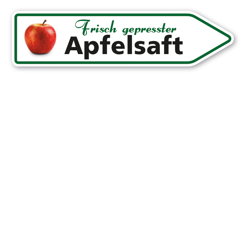 Pfeilschild / Verkaufsschild Frisch gepresster Apfelsaft - Hofschild – mit Abbildung als Hinweisschild zum Verkaufsstandort – für Verkaufsstände oder als Wegweiser zum Bauernhof. Dieser ansprechende und auffällige Verkaufwegweiser ist langlebig und bestens für den Außeneinsatz geeignet. Pfeilschilder, auch Pfeilwegweiser genannt, sind mit Ihrer Pfeilform eine bewährte Orientierungshilfe für Verkehrsteilnehmer und führen mit den aufgedruckten Informationen sicher zum Ziel. Unsere Pfeilschilder sind als Standardartikel oder in individuellen, an Ihre Bedürfnisse angepassten Ausführungen in mehreren Farben und Größen erhältlich. Für eine bessere Sichtbarkeit können alle Pfeilwegweiser auch reflektierend ausgerüstet werden.