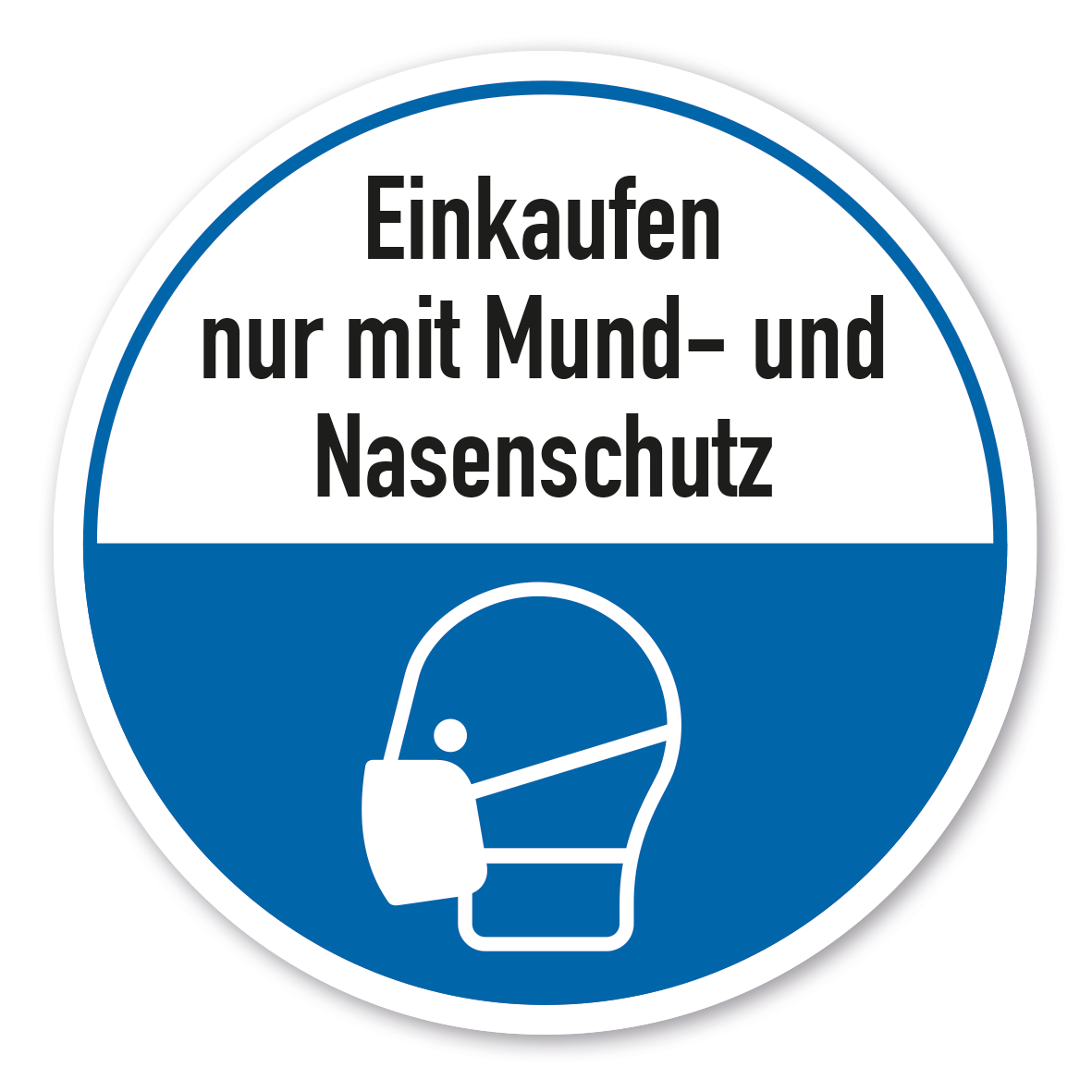 Hygienehinweis Einkaufen nur mit Mund- und Nasenschutz - als Schild im Außen- oder Innenbereich, Aufkleber für Wände und Türen oder als strapazierfähige Bodenkleber mit rutschfestem Schutzlaminat für hochfrequentierte Zonen im Mitarbeiter- und Kundenverkehr – als Warnmarkierung für z.B. Verkaufsräume, Ladenzeilen, öffentliche Einrichtungen und Verwaltungsgebäude, Wartezonen, Labore, Gewerbeobjekte und andere Bereiche mit erhöhter Infektionsgefahr, in denen es auf eine konsequente Distanzeinhaltung zu anderen Personen oder andere gesundheitsrelevante Informationen ankommt.