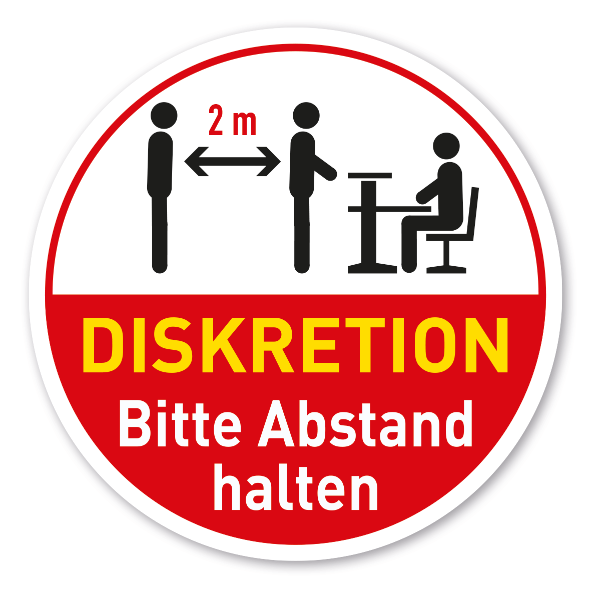 Diskretionshinweis Diskretion - Bitte 2 m Abstand halten - als Schild im Außen- oder Innenbereich, Aufkleber für Wände und Türen oder als strapazierfähige Bodenkleber mit rutschfestem Schutzlaminat für Mitarbeiter- und Kundenverkehrzonen – z.B. für Verkaufsräume, Ladenzeilen, öffentliche Einrichtungen, Verwaltungsgebäude und andere Bereiche, in denen es auf eine konsequente Einhaltung der Diskretion ankommt.