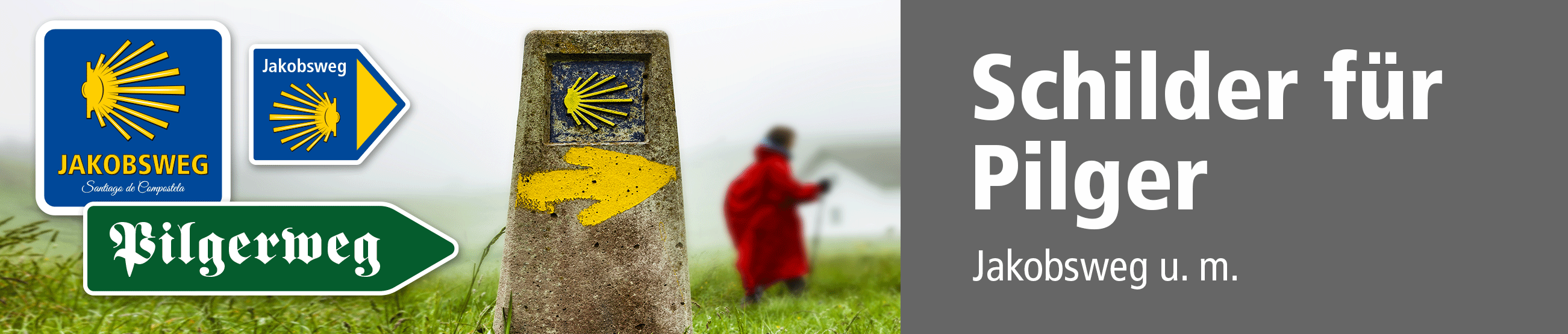 Wir führen diverse Schilder und Kennzeichnungen für Pilgerwege, die meisten mit dem bekanntesten Symbol: der Jakobsmuschel, aber auch Schilder mit einem anderen alten Symbol, das einen Pilgerstab, eine Muschel und Kalebasse vereint. Die Schilder mit diesem Symbol wurden von uns als Maibaumschilder konzipiert, können aber auch sehr gut als einzigartige Erinnerungsschilder an eine bereits erfolgte wie auch bevorstehende Pilgerreise genutzt werden.