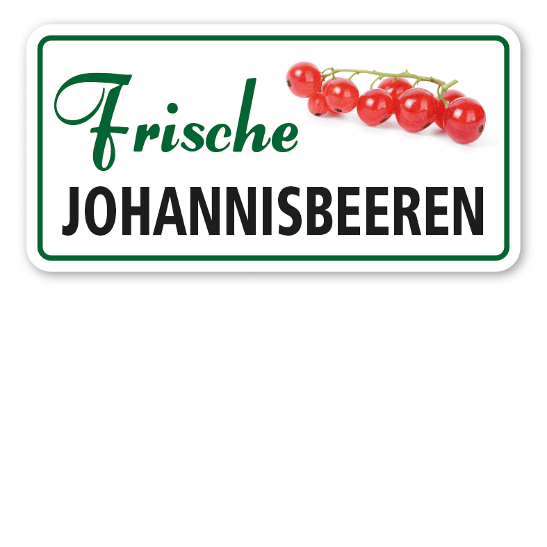 Verkaufsschild Frische Johannisbeeren. Unsere Schilder sind in zahlreichen Größen und Ausführungen als Standardartikel oder mit Ihrem Wunschtext für eine bedarfsbezogene Beschilderung erhältlich.