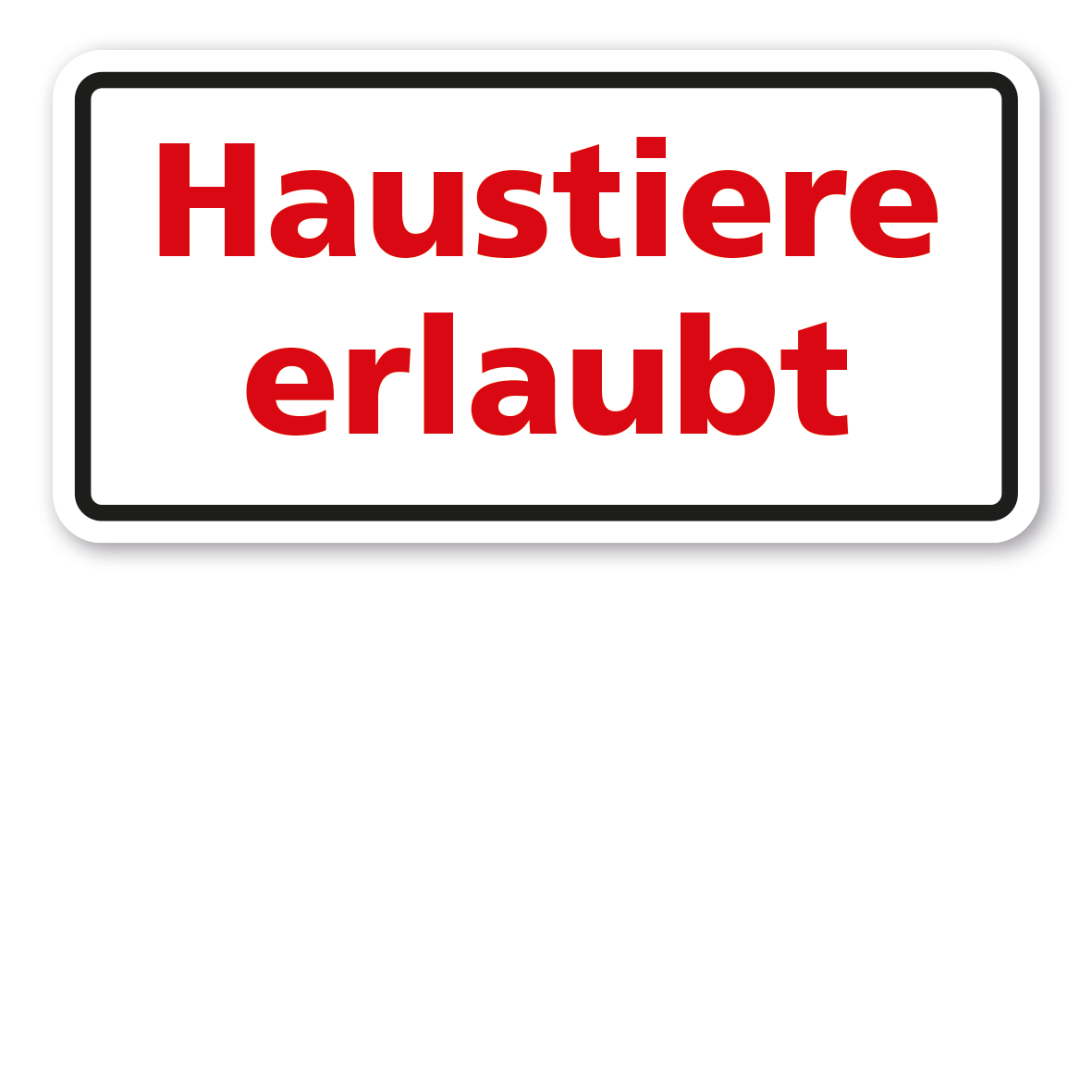 Textschild Haustiere erlaubt. Textschilder sind Hinweisschilder mit reinen Textinhalten in zahlreichen Größen und Ausführungen. Sie können als Standardschilder für diverse Themenbereiche oder in individuellen Ausführungen für eine bedarfsbezogene Beschilderung erworben werden.
