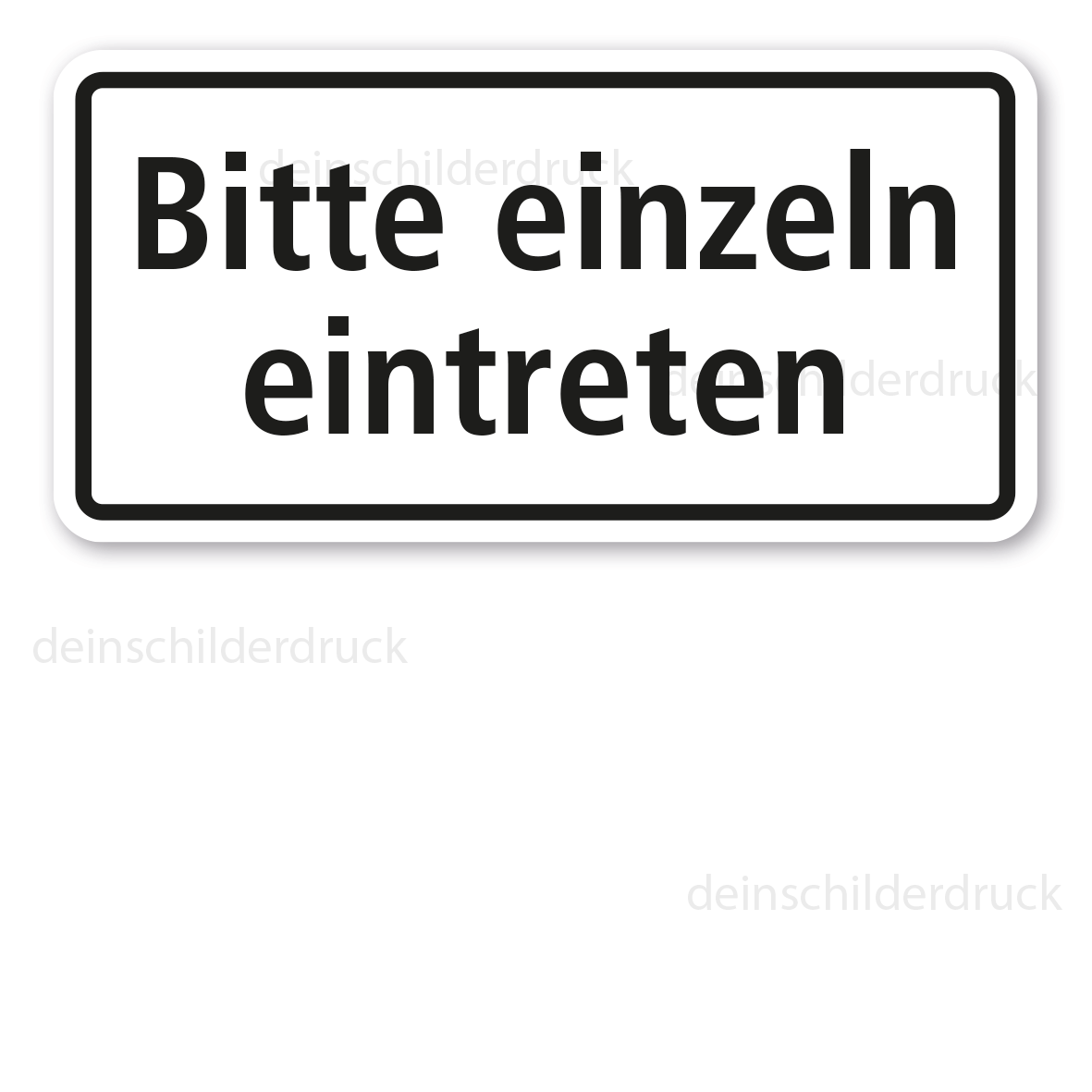 Textschild Bitte einzeln eintreten. Textschilder sind Hinweisschilder mit reinen Textinhalten in zahlreichen Größen und Ausführungen. Sie können als Standardschilder für diverse Themenbereiche oder in individuellen Ausführungen für eine bedarfsbezogene Beschilderung erworben werden.