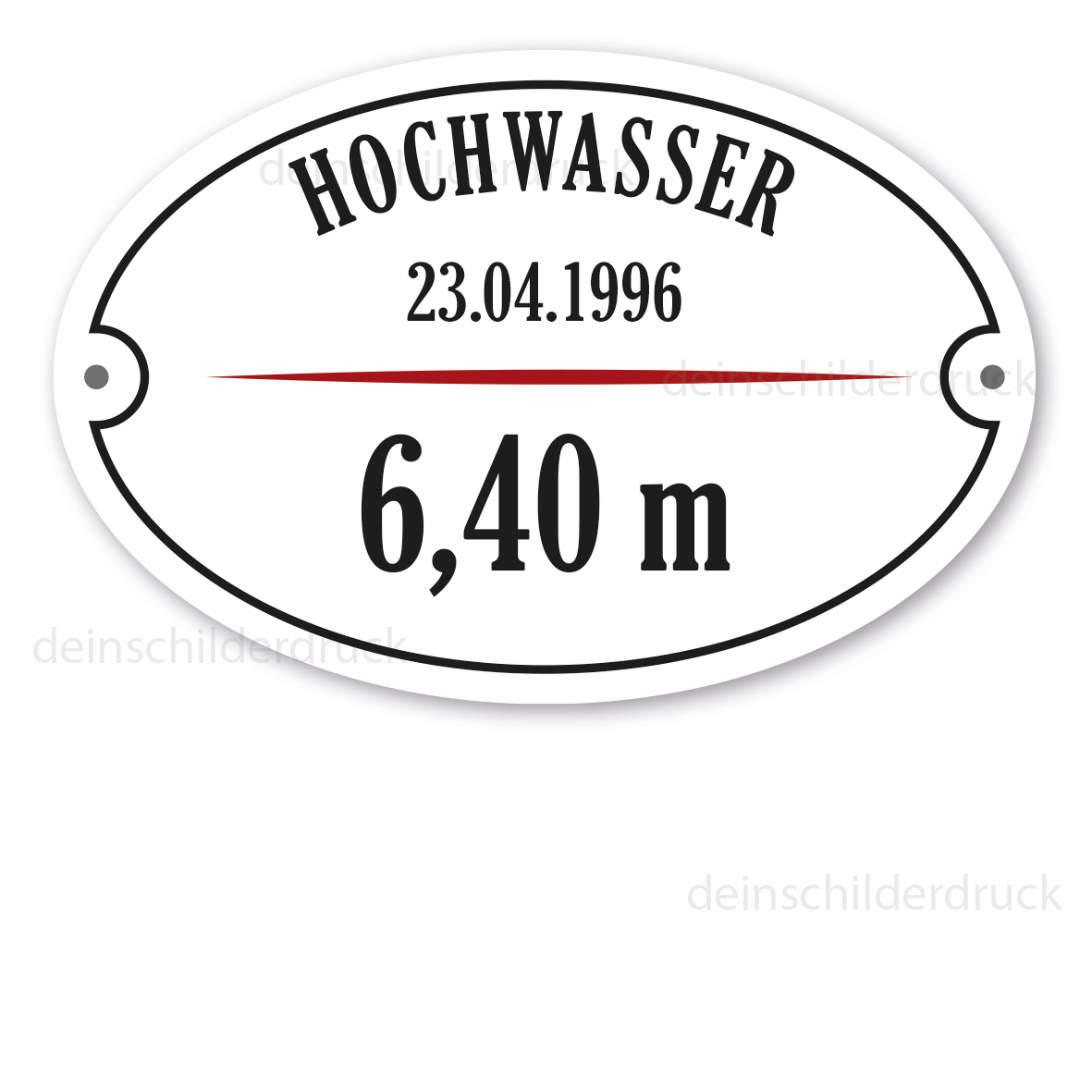 Merkmale des Schildes Hochwassermarke - Hochwasserschild mit Ihren Daten – ovale Ausführung mit 2 Löchern – STR-IND-19-W: