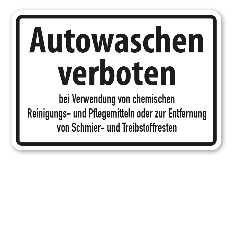 Vereinsschild Autowaschen verboten bei Verwendung von chemischen Reinigungs- und Pflegemitteln oder zur Entfernung von Schmier- und Treibstoffresten. Textschilder sind Hinweisschilder mit reinen Textinhalten in zahlreichen Größen und Ausführungen. Sie können als Standardschilder für diverse Themenbereiche oder in individuellen Ausführungen für eine bedarfsbezogene Beschilderung erworben werden.