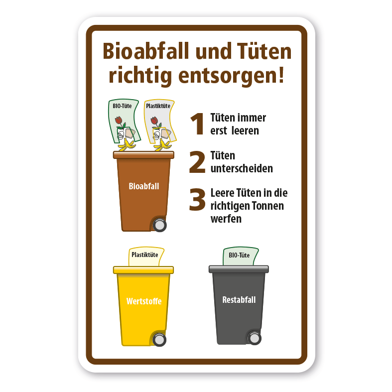 Schild zur Abfallentsorgung Bioabfall und Tüten richtig entsorgen